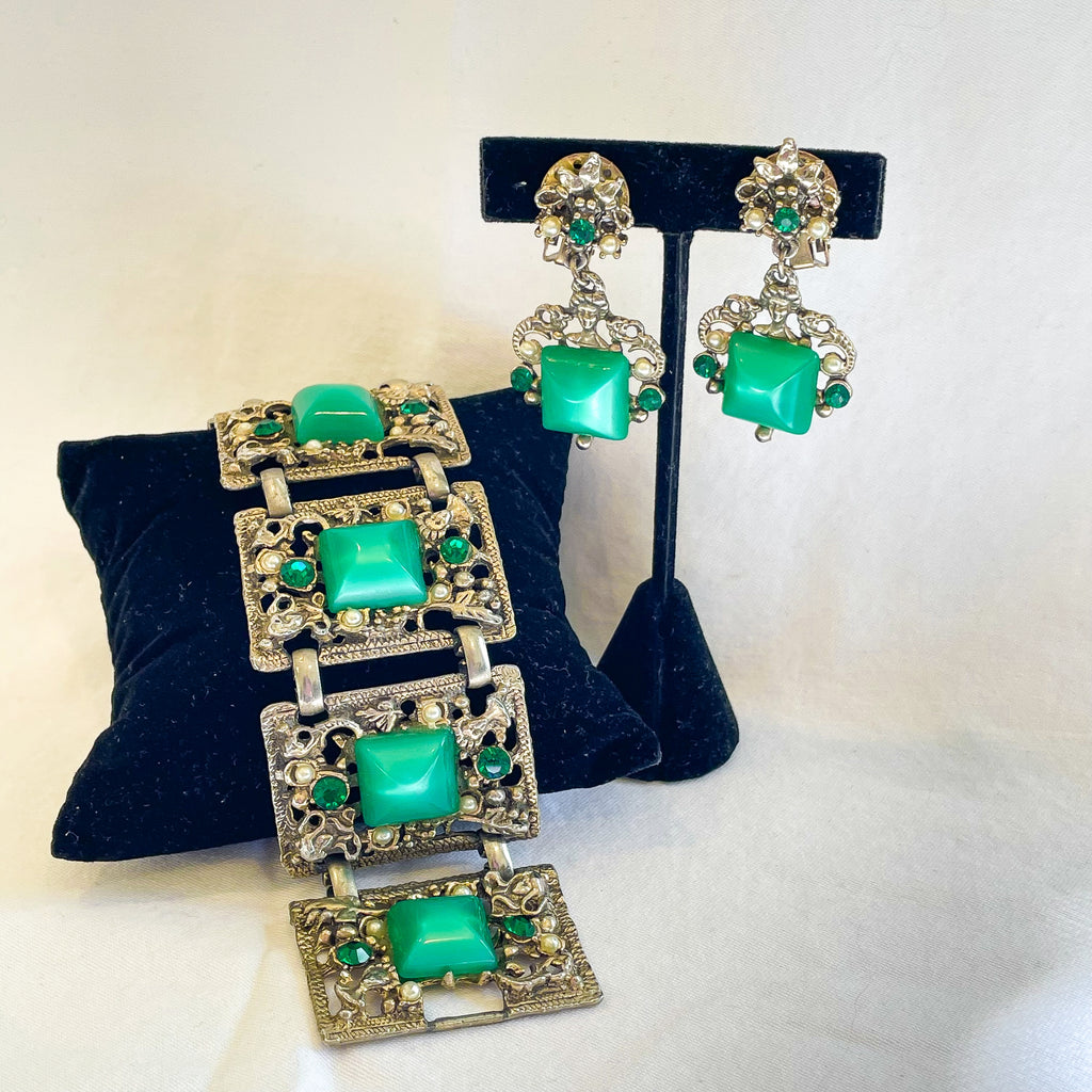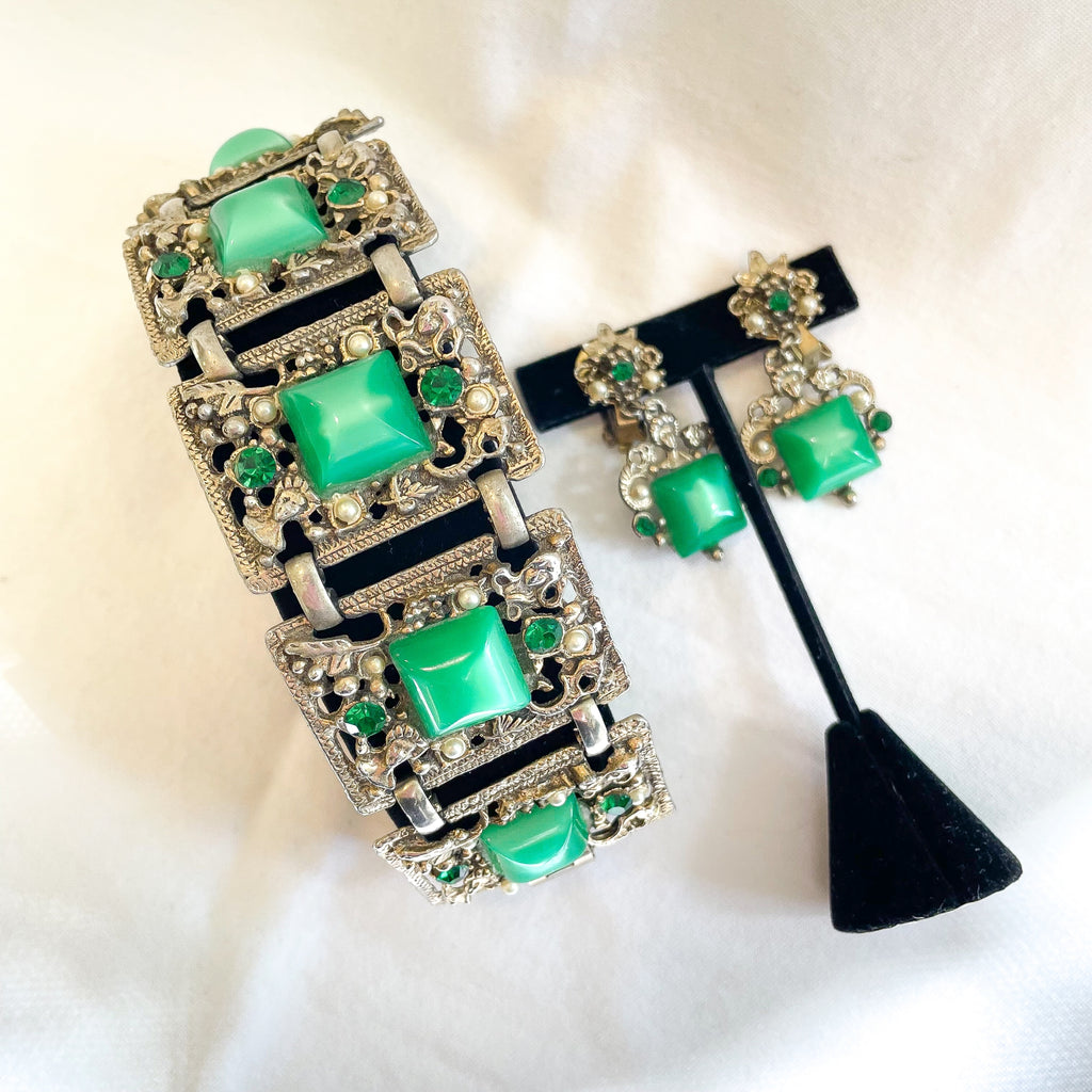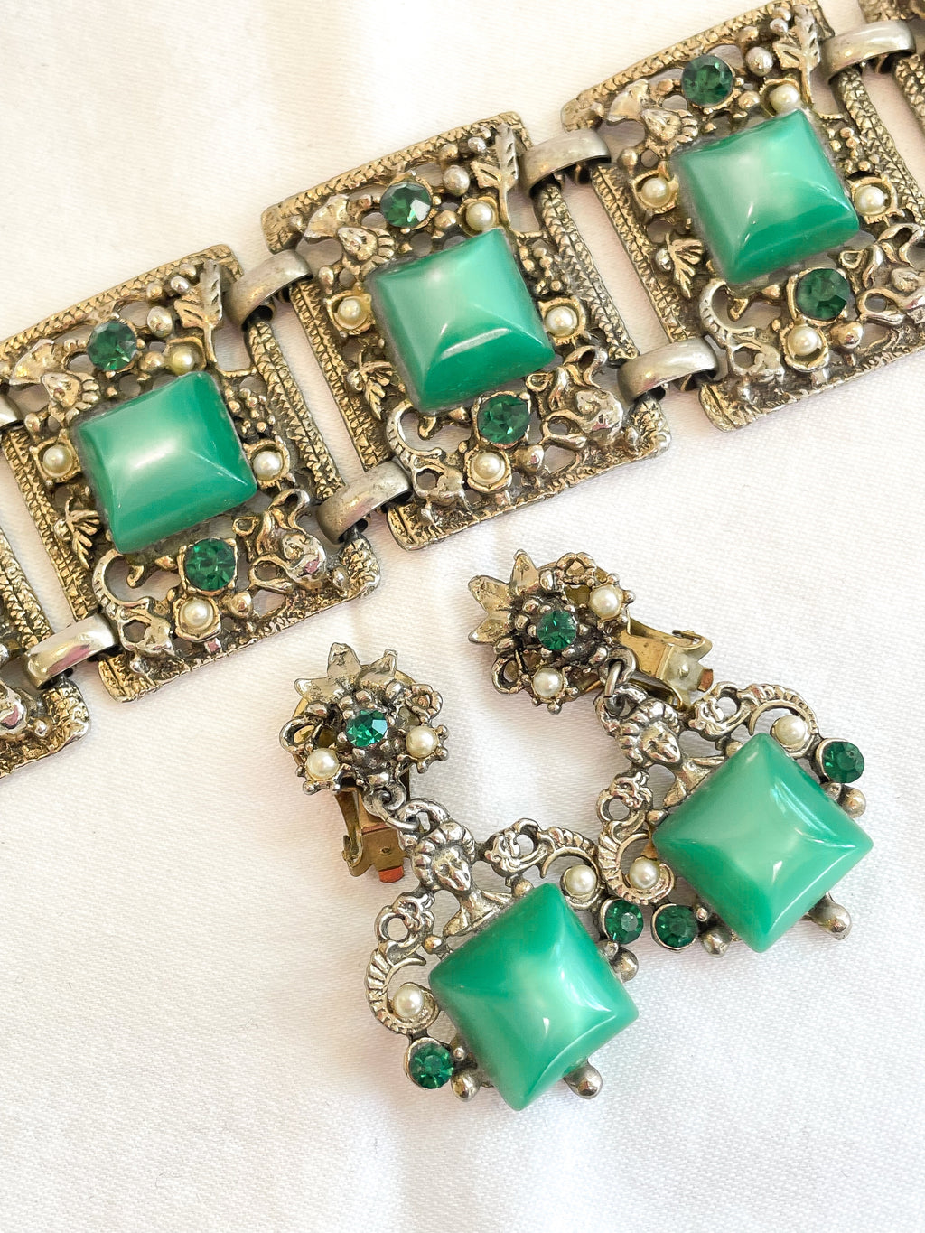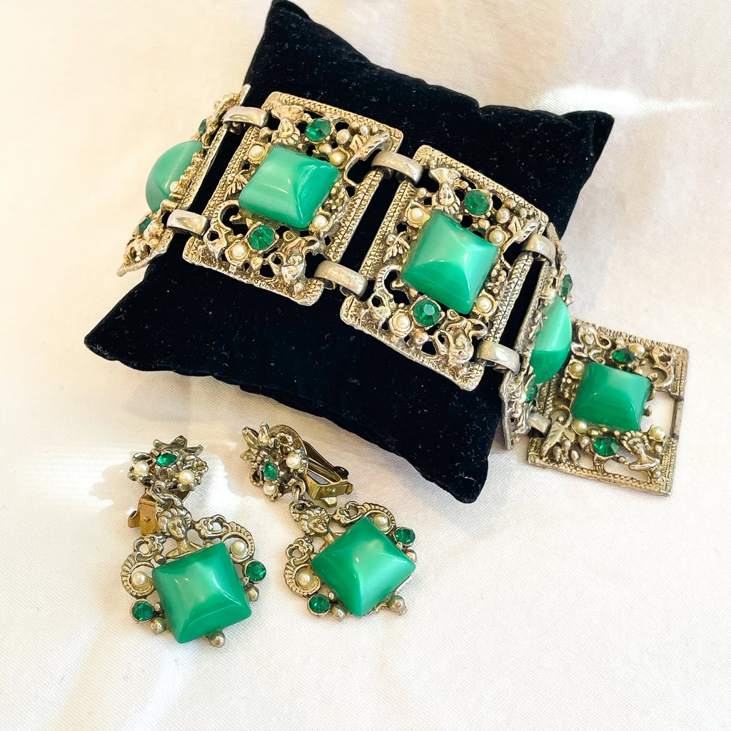Amazing Vintage gold tone green Lucite moonglow bracelet set with 1 pair matching earrings.