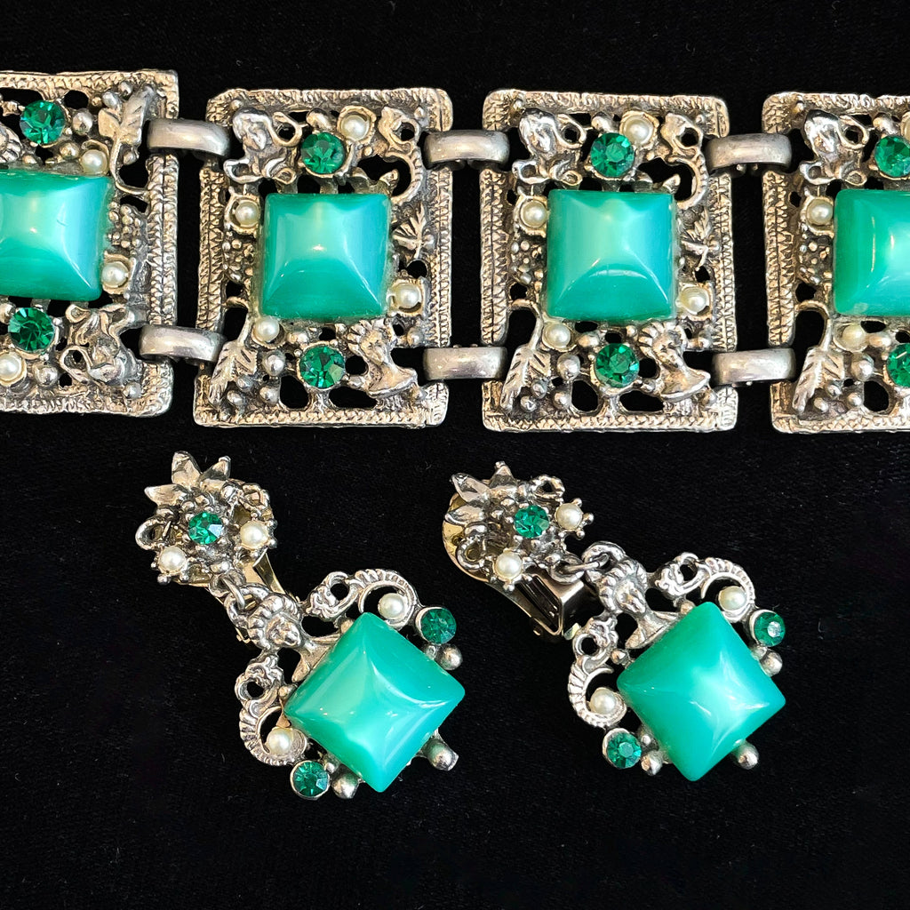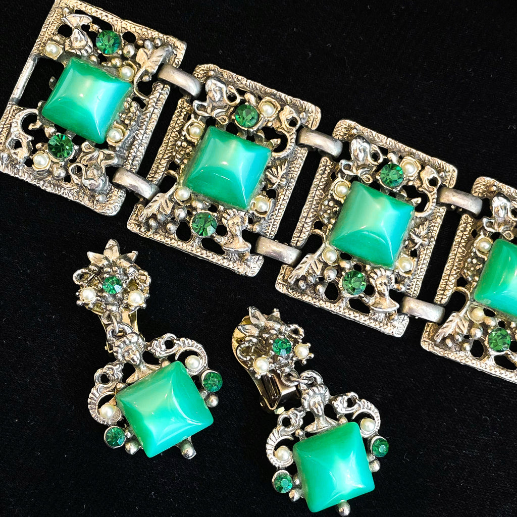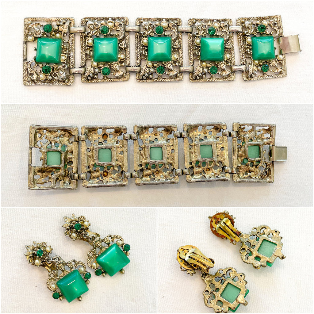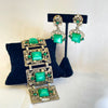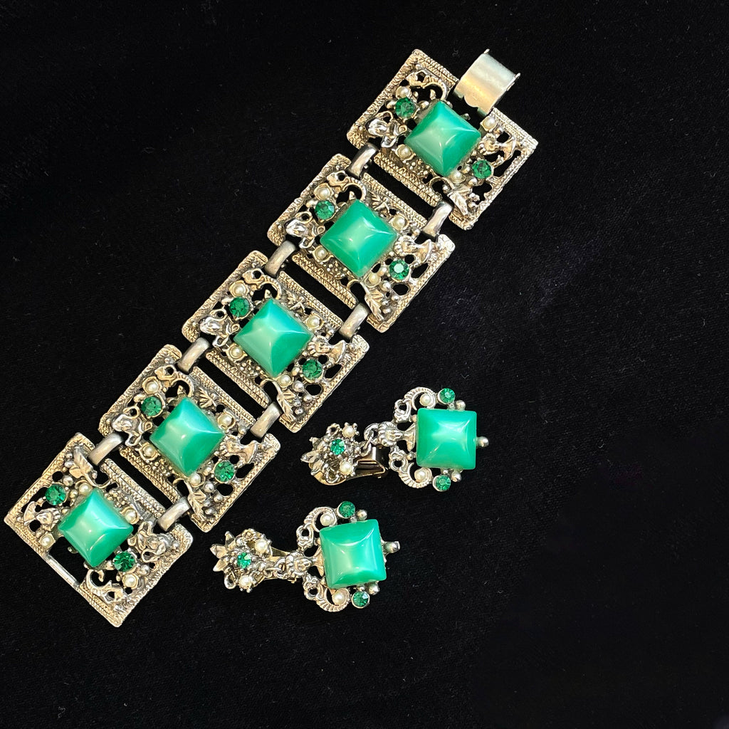Amazing Vintage gold tone green Lucite moonglow bracelet set with 1 pair matching earrings.