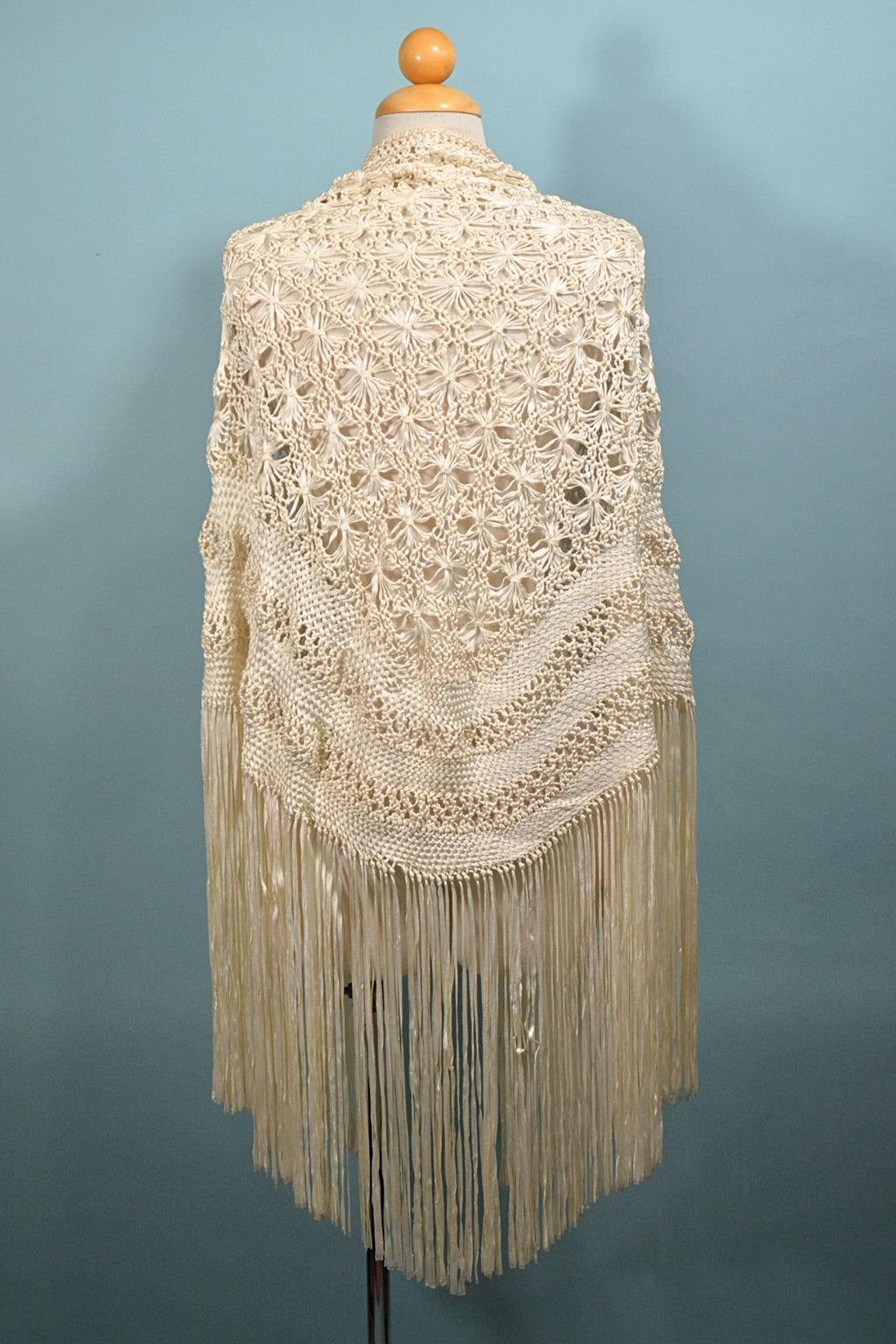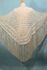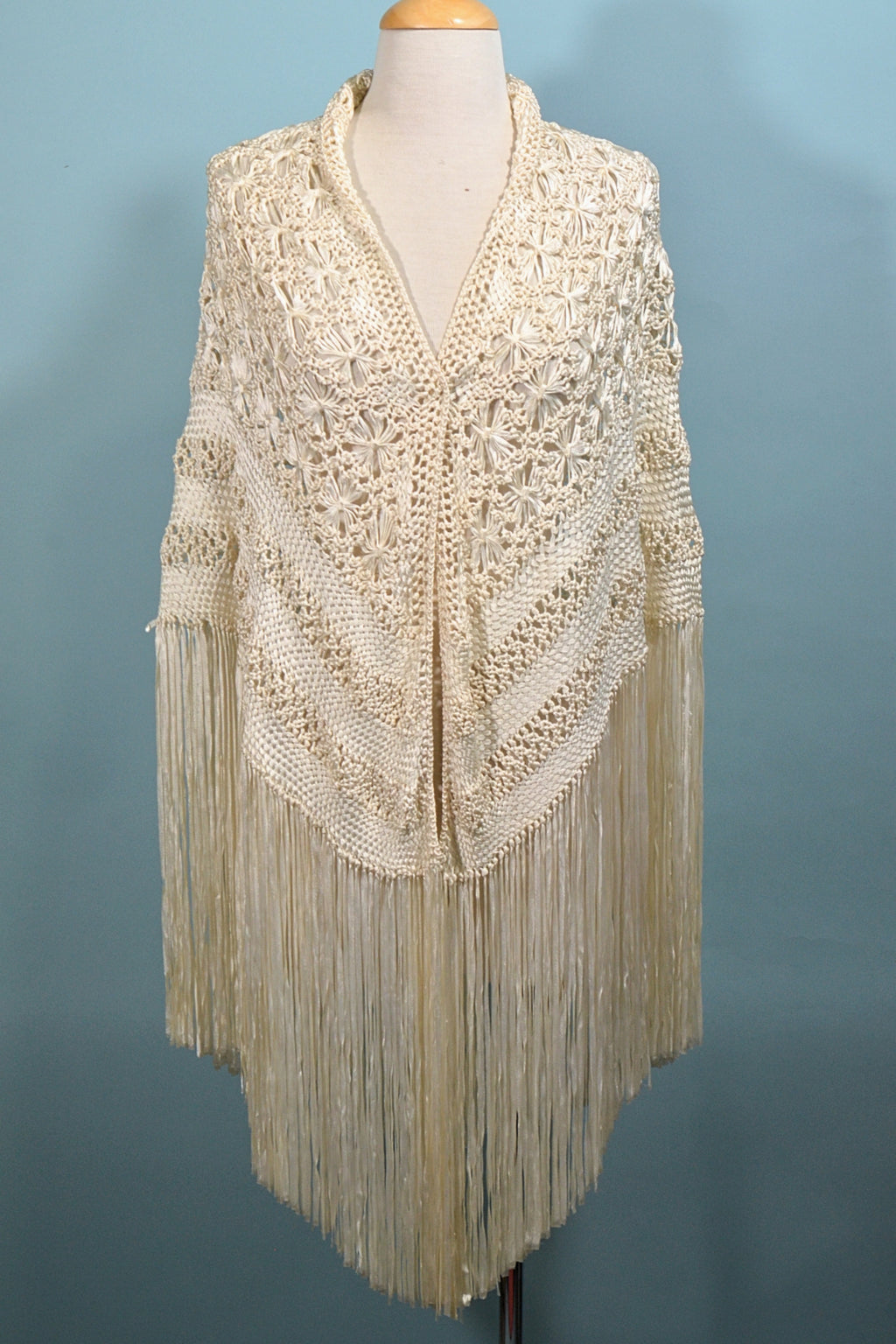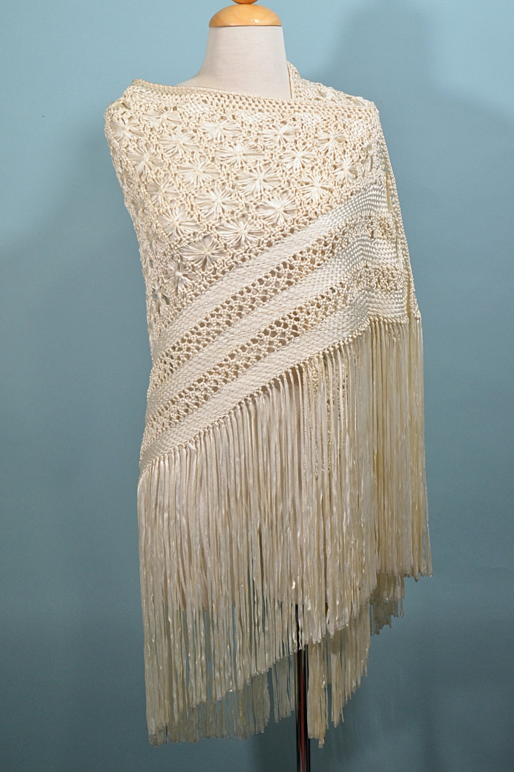 This is a beautiful handmade macrame/crochet ribbon fringe shawl.