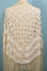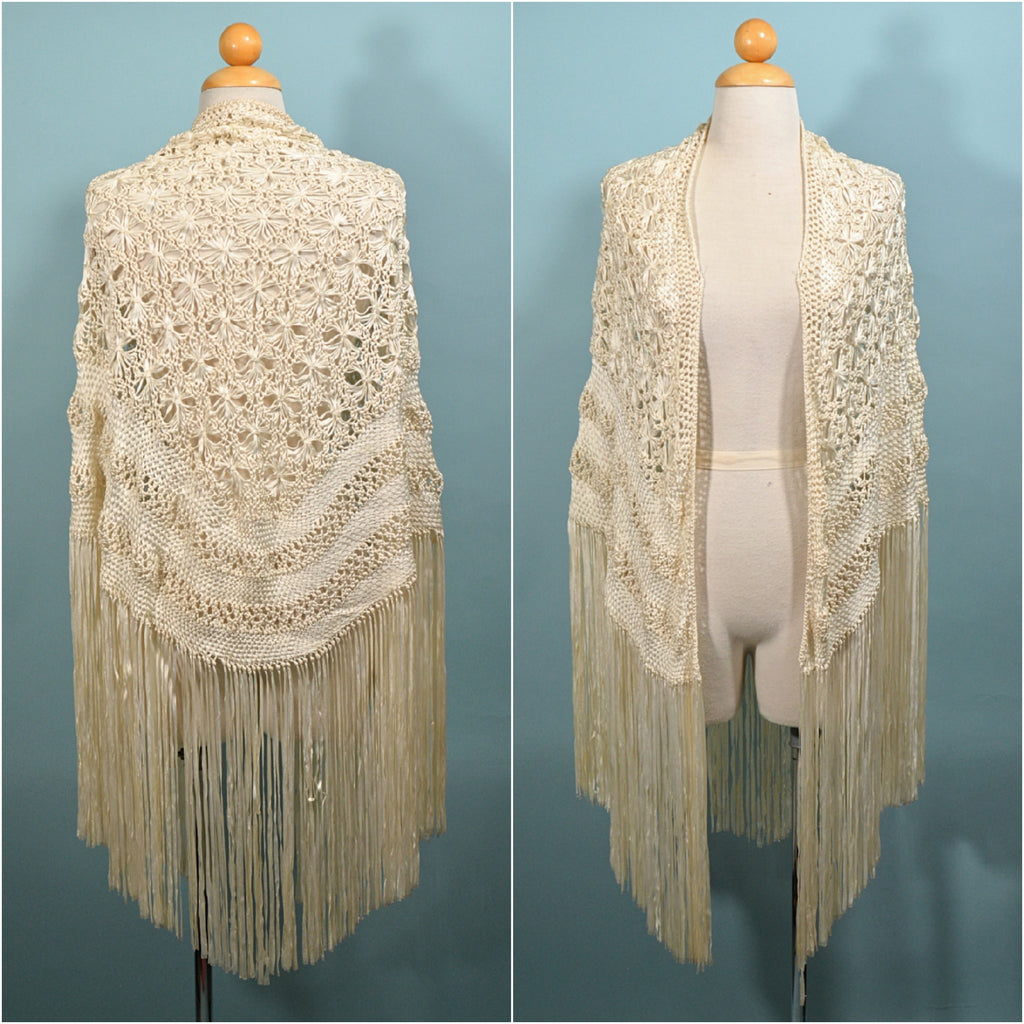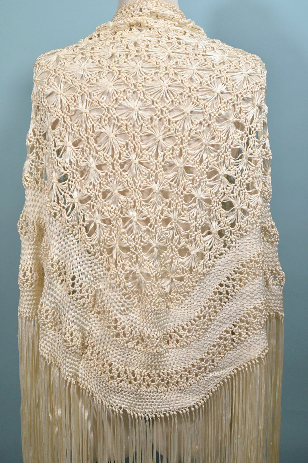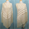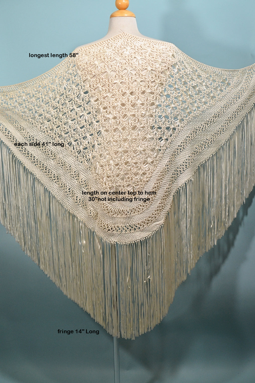 This is a beautiful handmade macrame/crochet ribbon fringe shawl.