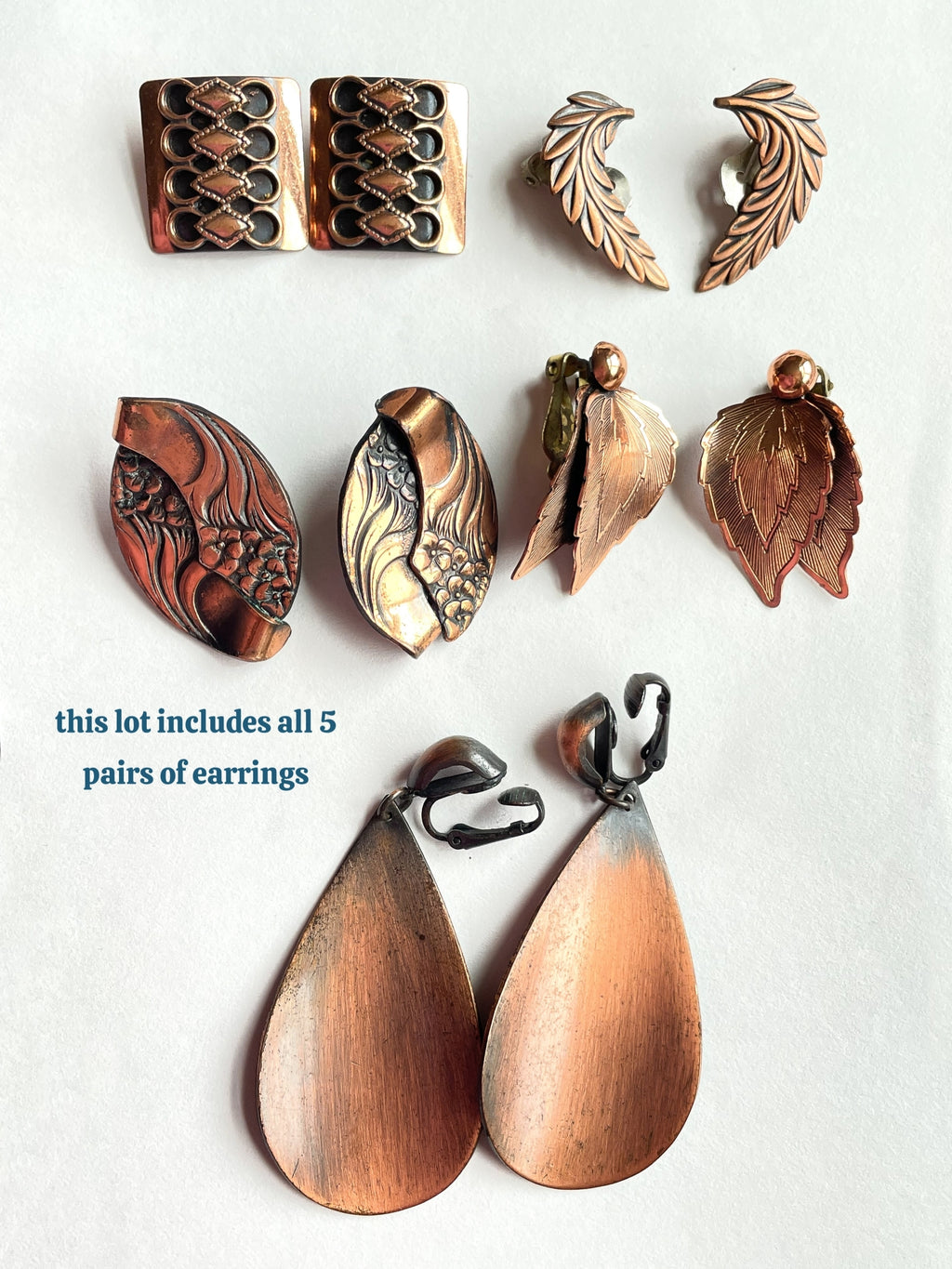 SOLD Vintage MCM Copper Earrings, Clip Back 5 Pair 1 lot