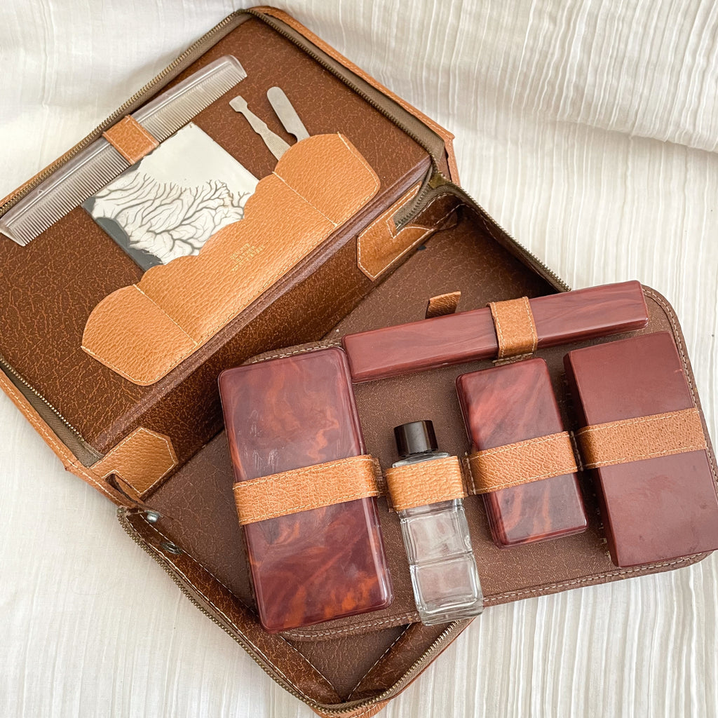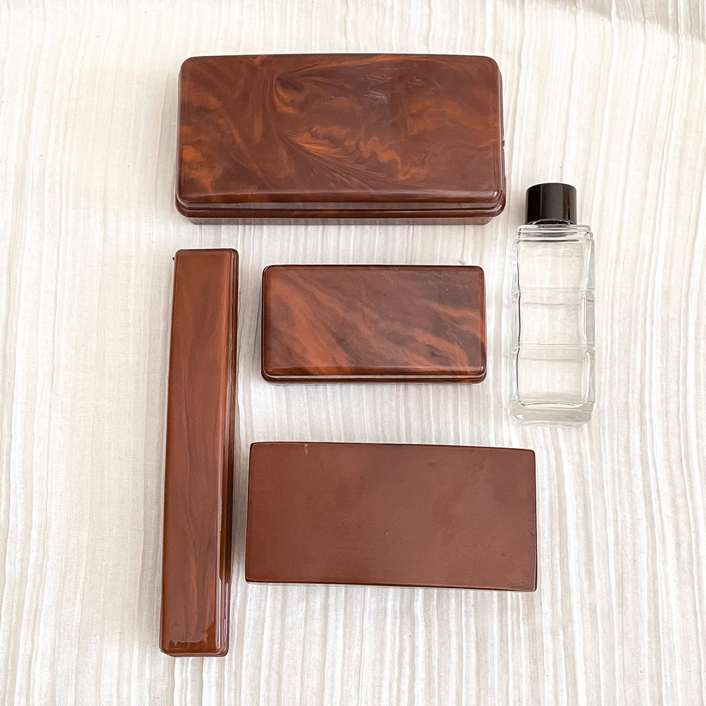 The interior lining is a darker color. Marbled plastic/Lucite brownish red.