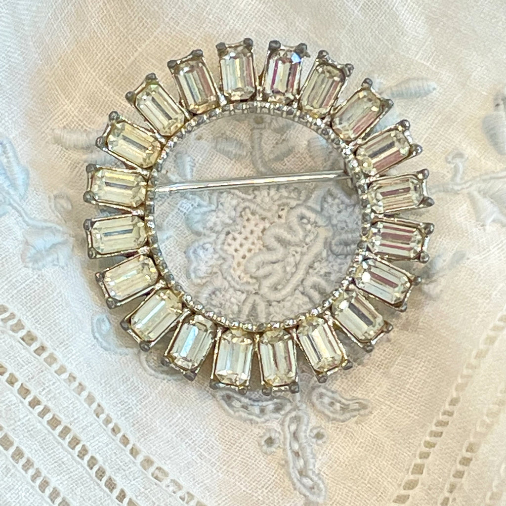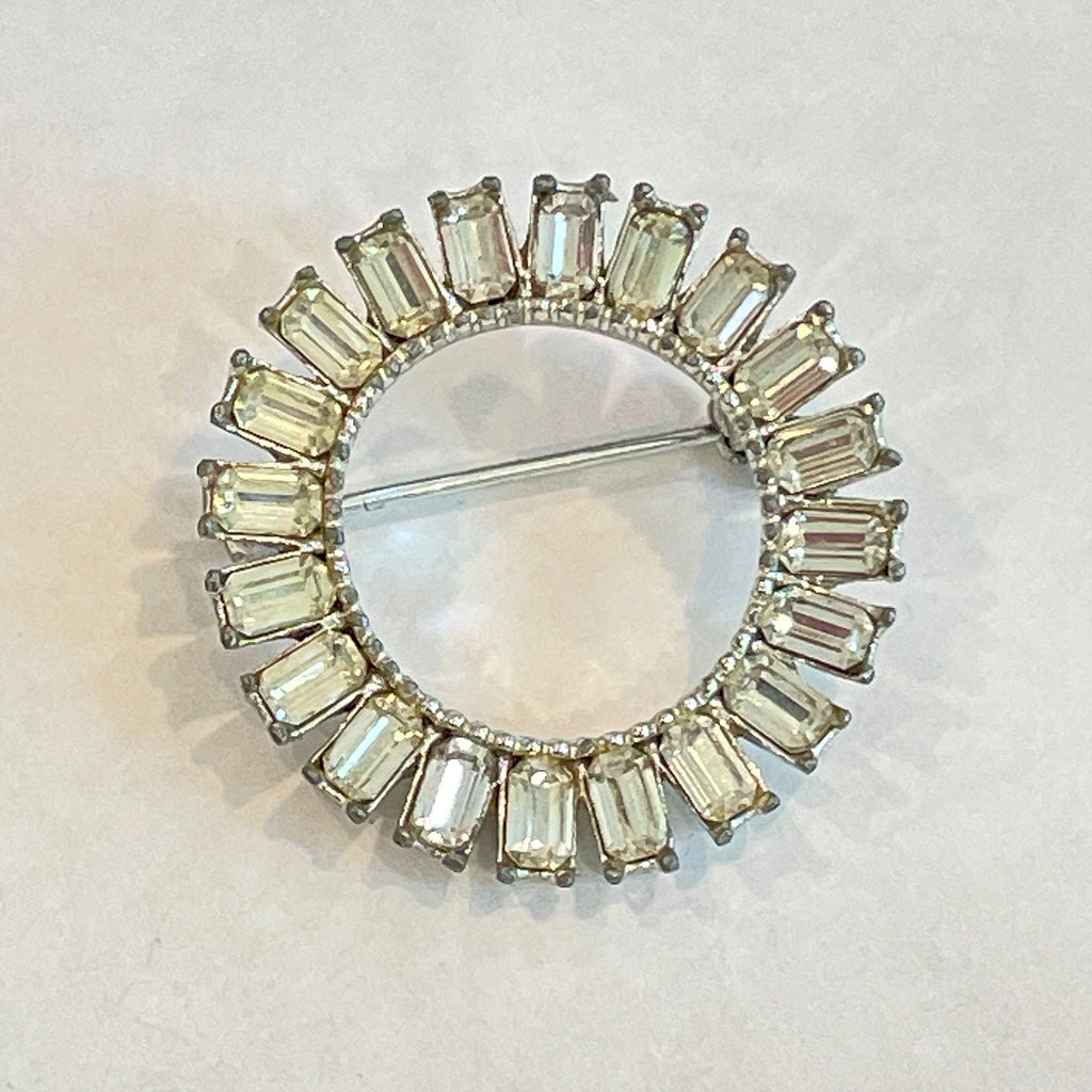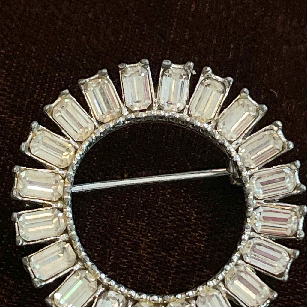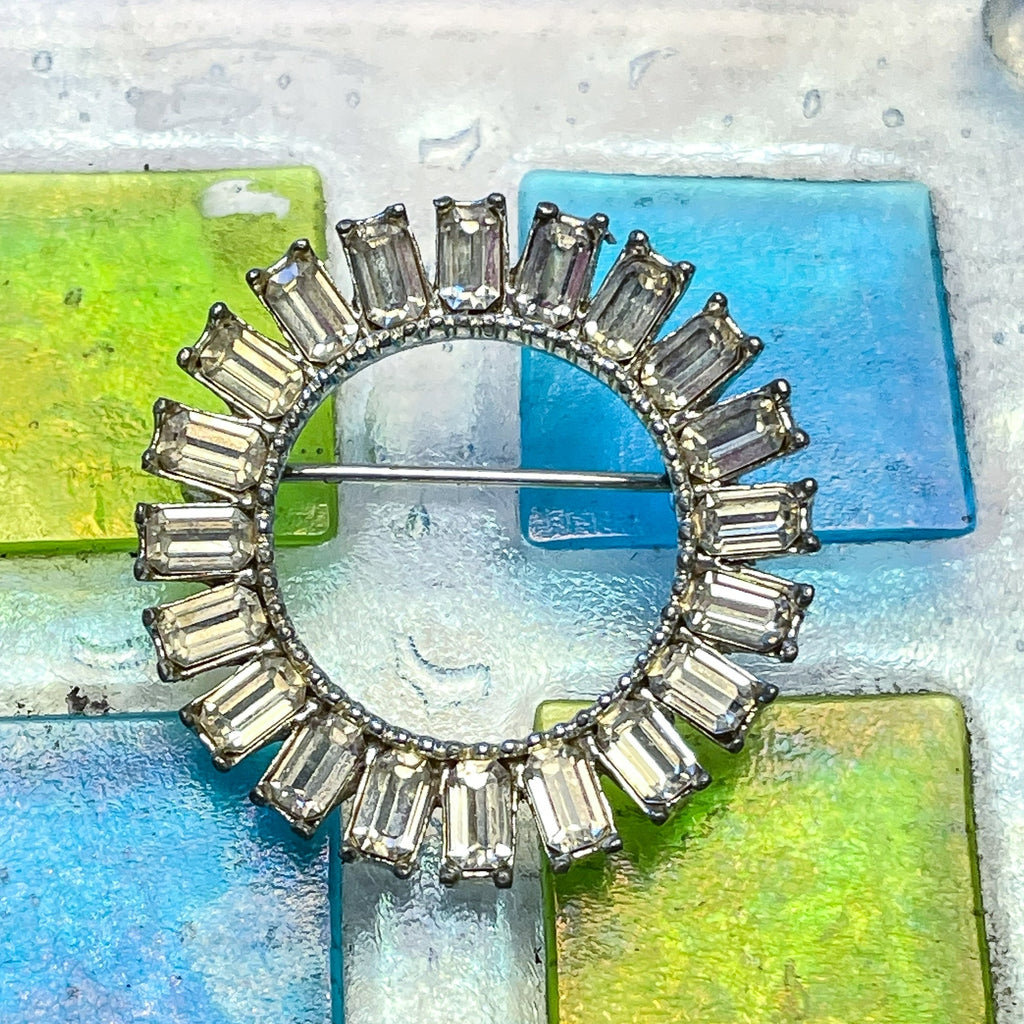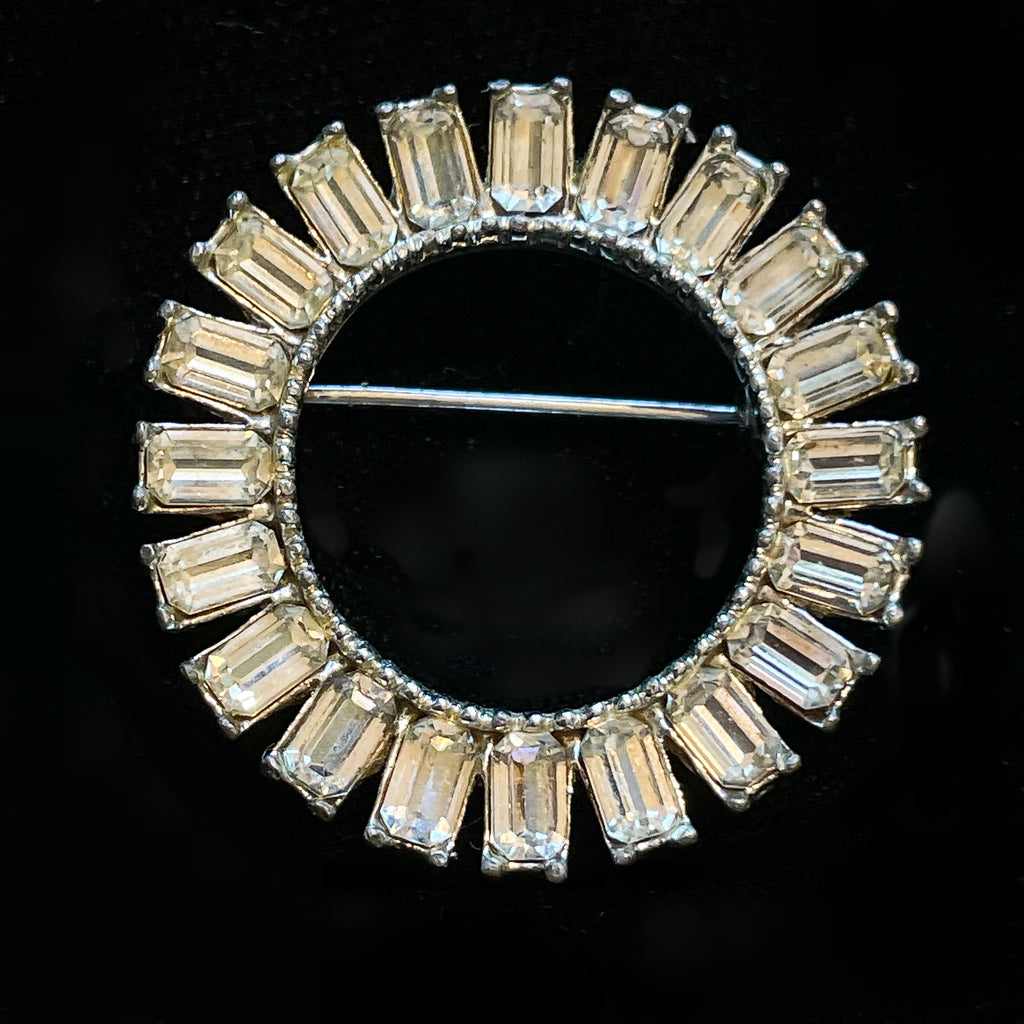 Vintage MCM circular clear rhinestone brooch with baguette stones,