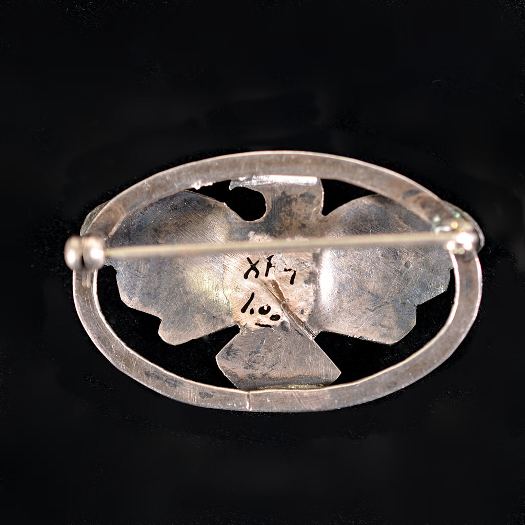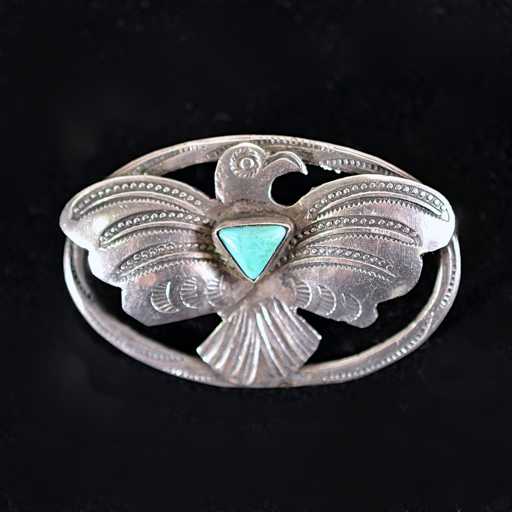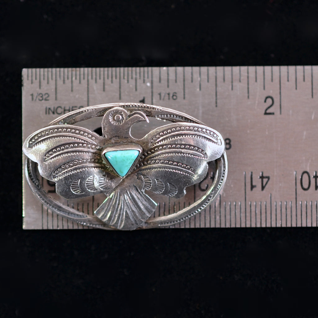 DESCRIPTION: Lovely vintage sterling silver thunderbird brooch. Stamped silver details with turquoise stone in the center of the pin. The bird is set on an oval base.