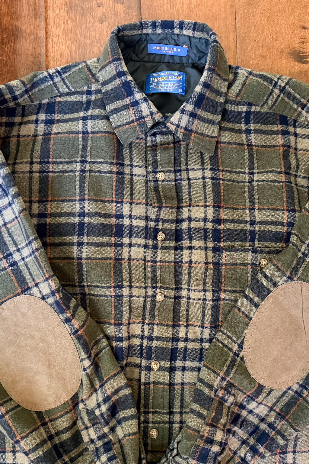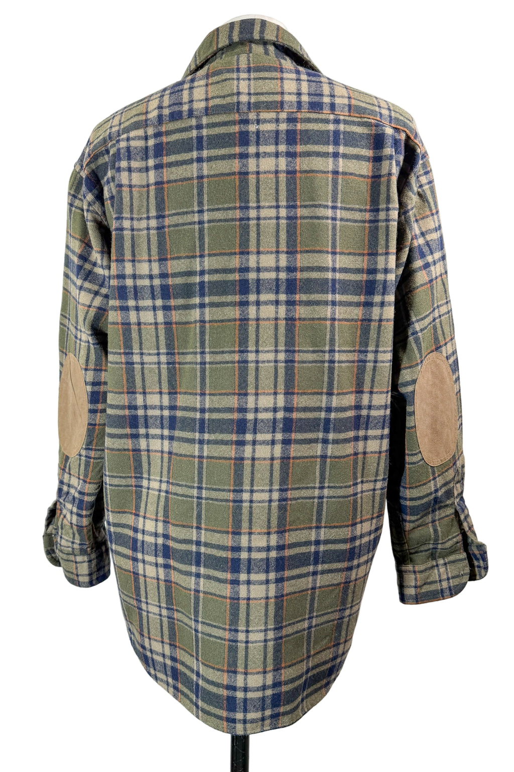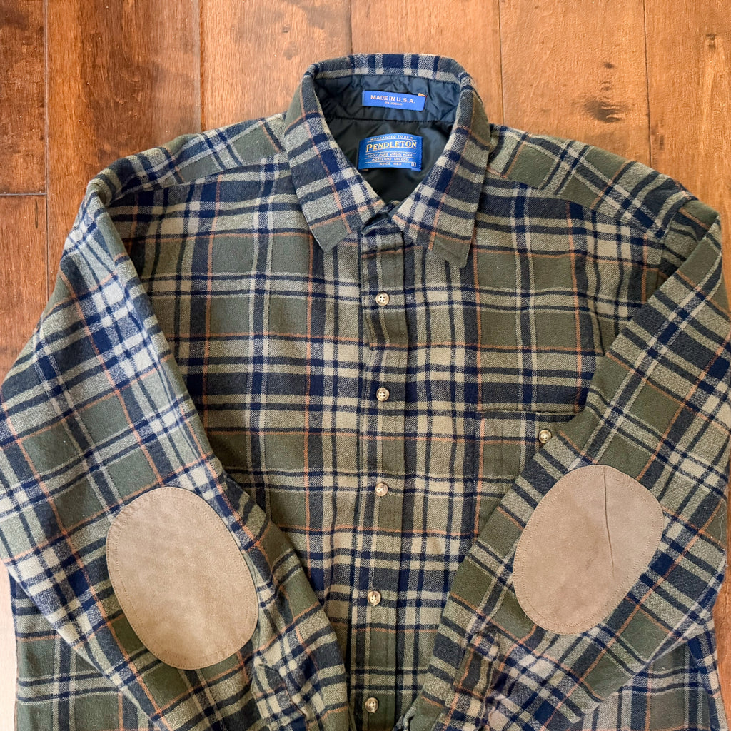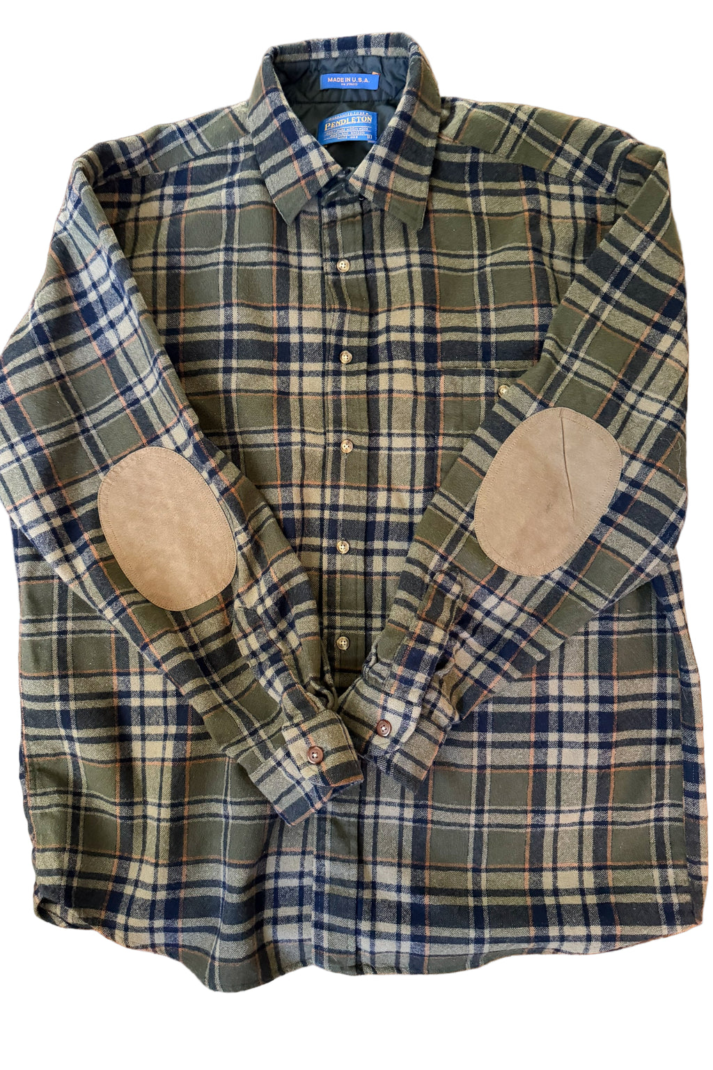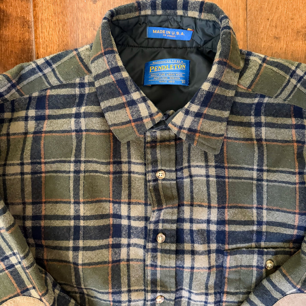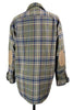 Pendleton wool plaid shirt with button pocket and suede elbow patches.