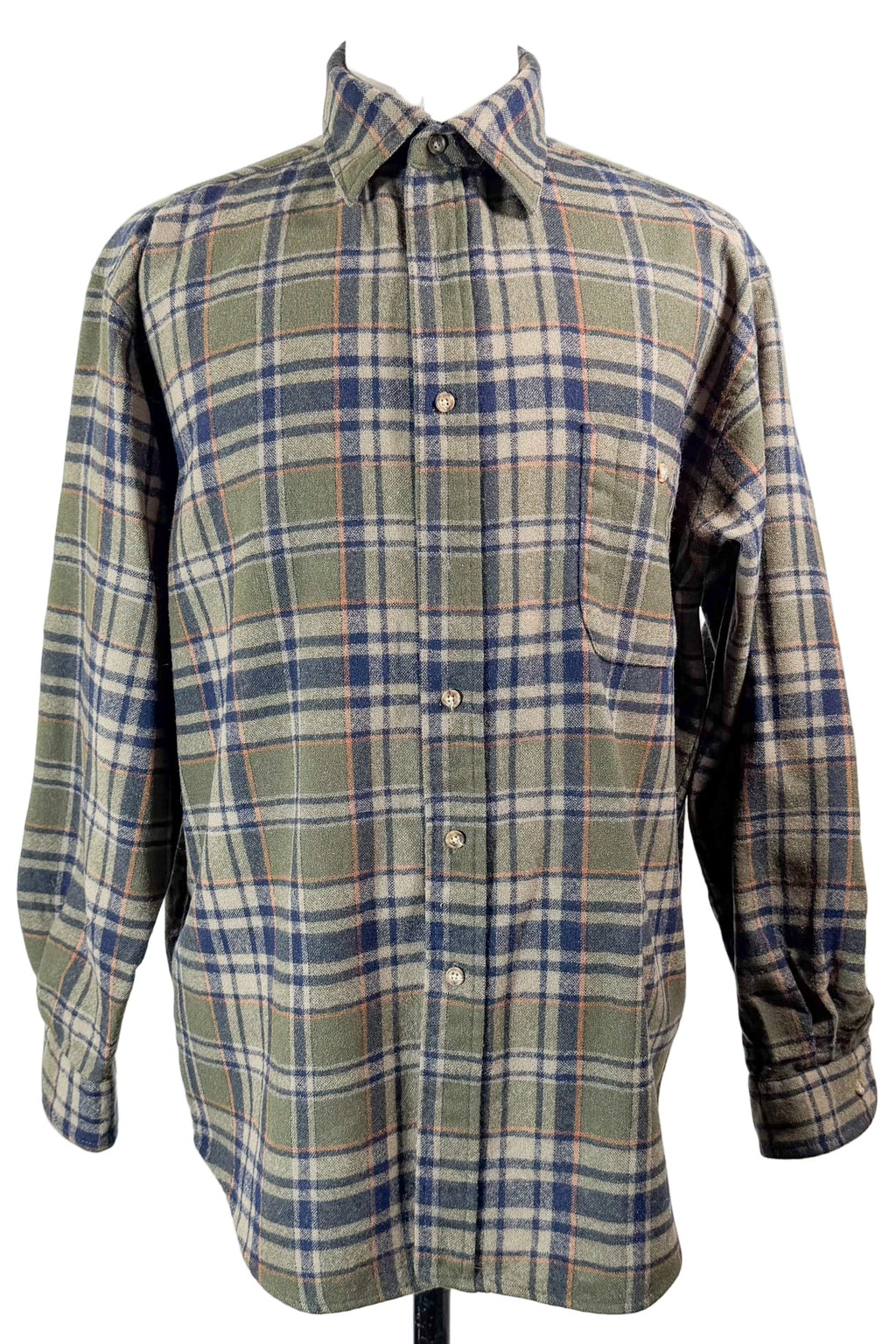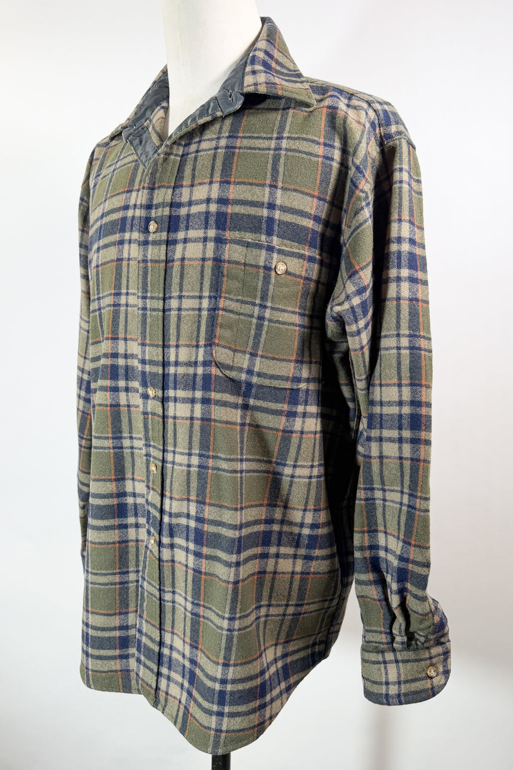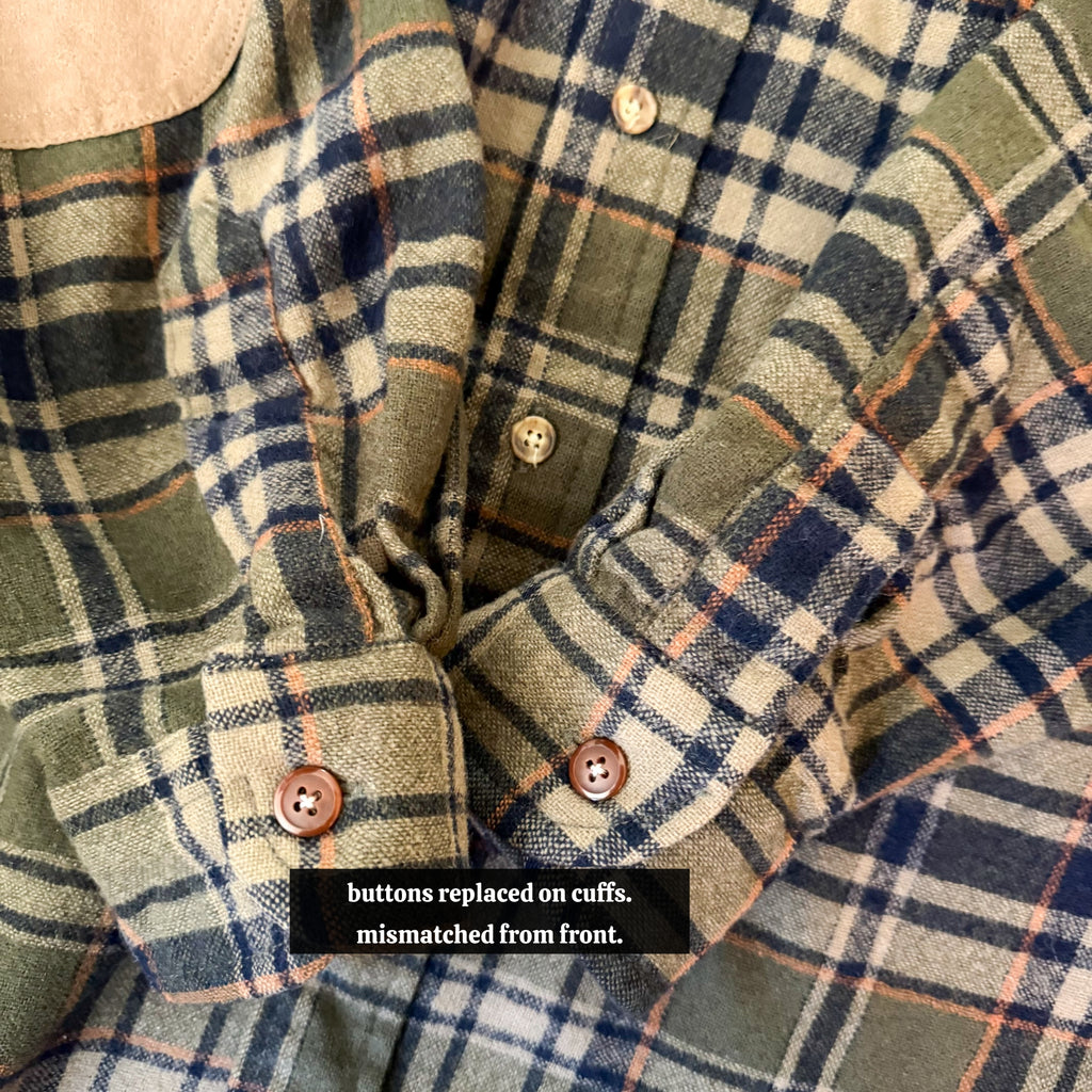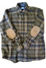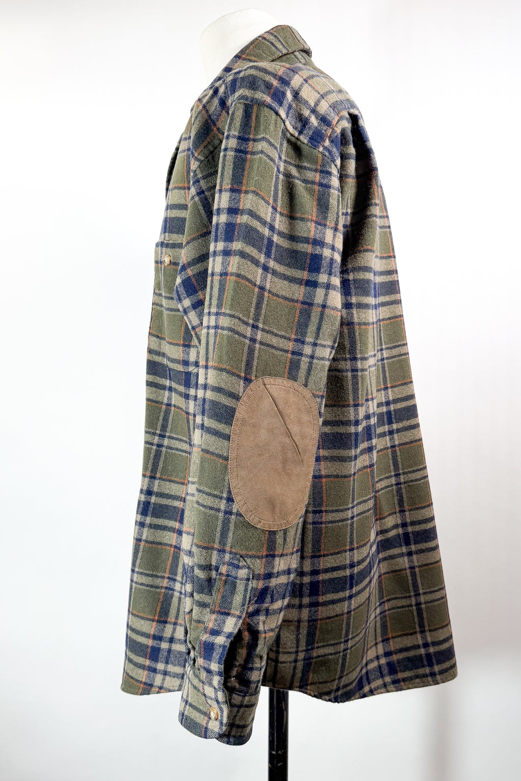 Pendleton wool plaid shirt with button pocket and suede elbow patches.