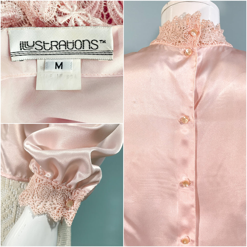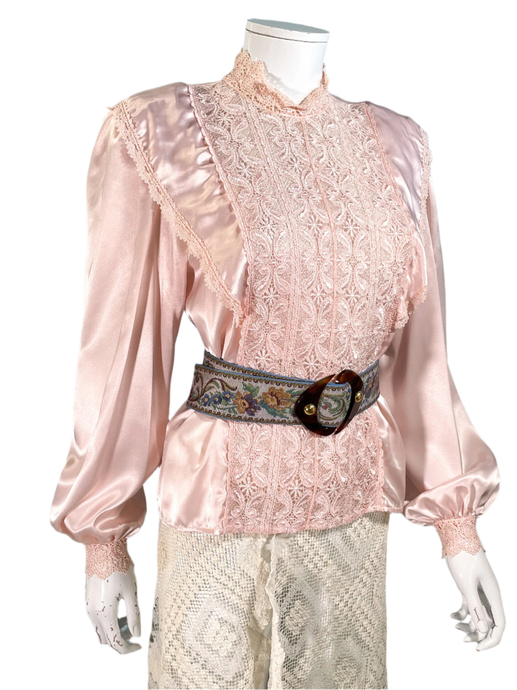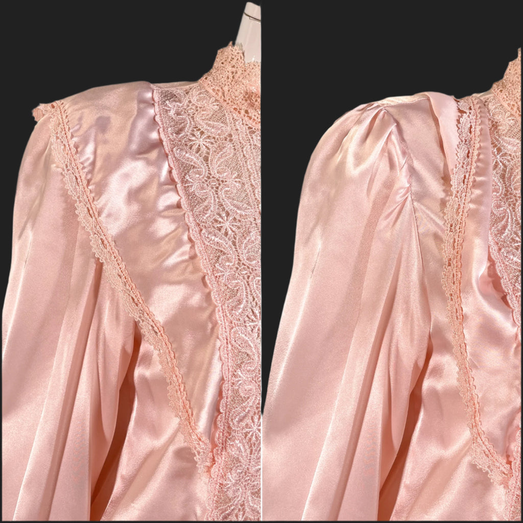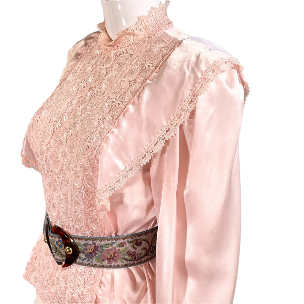 Vintage pink granny Victorian style blouse with cream high lace neckline.