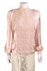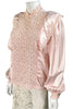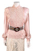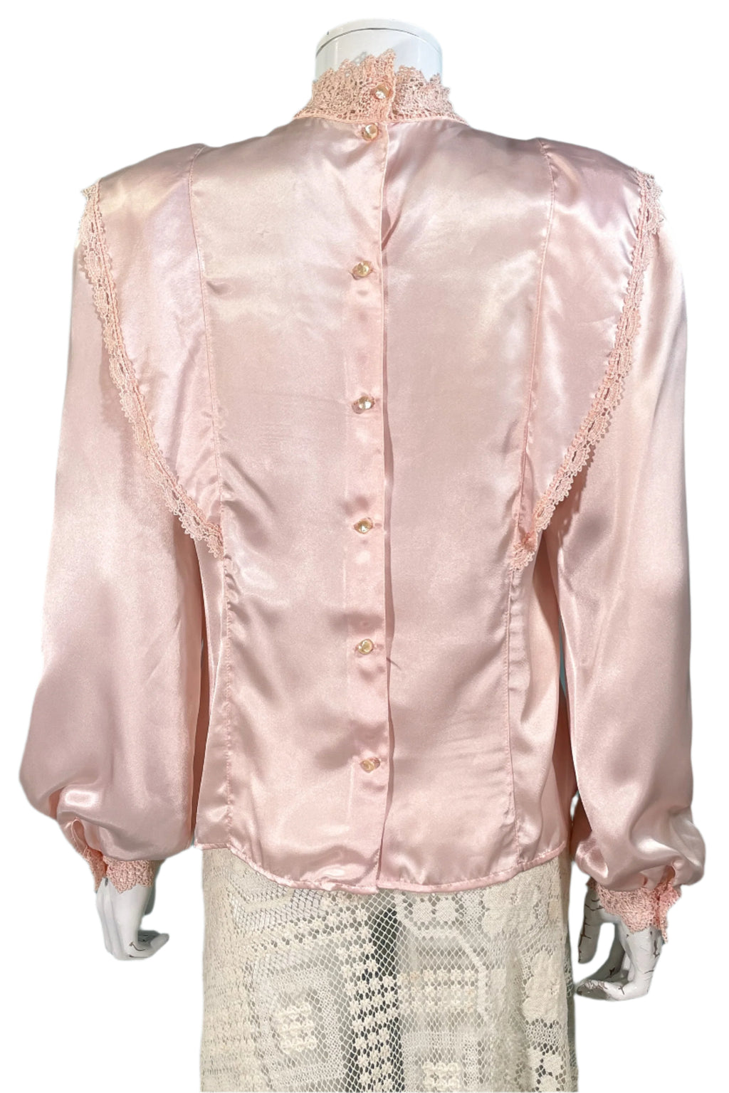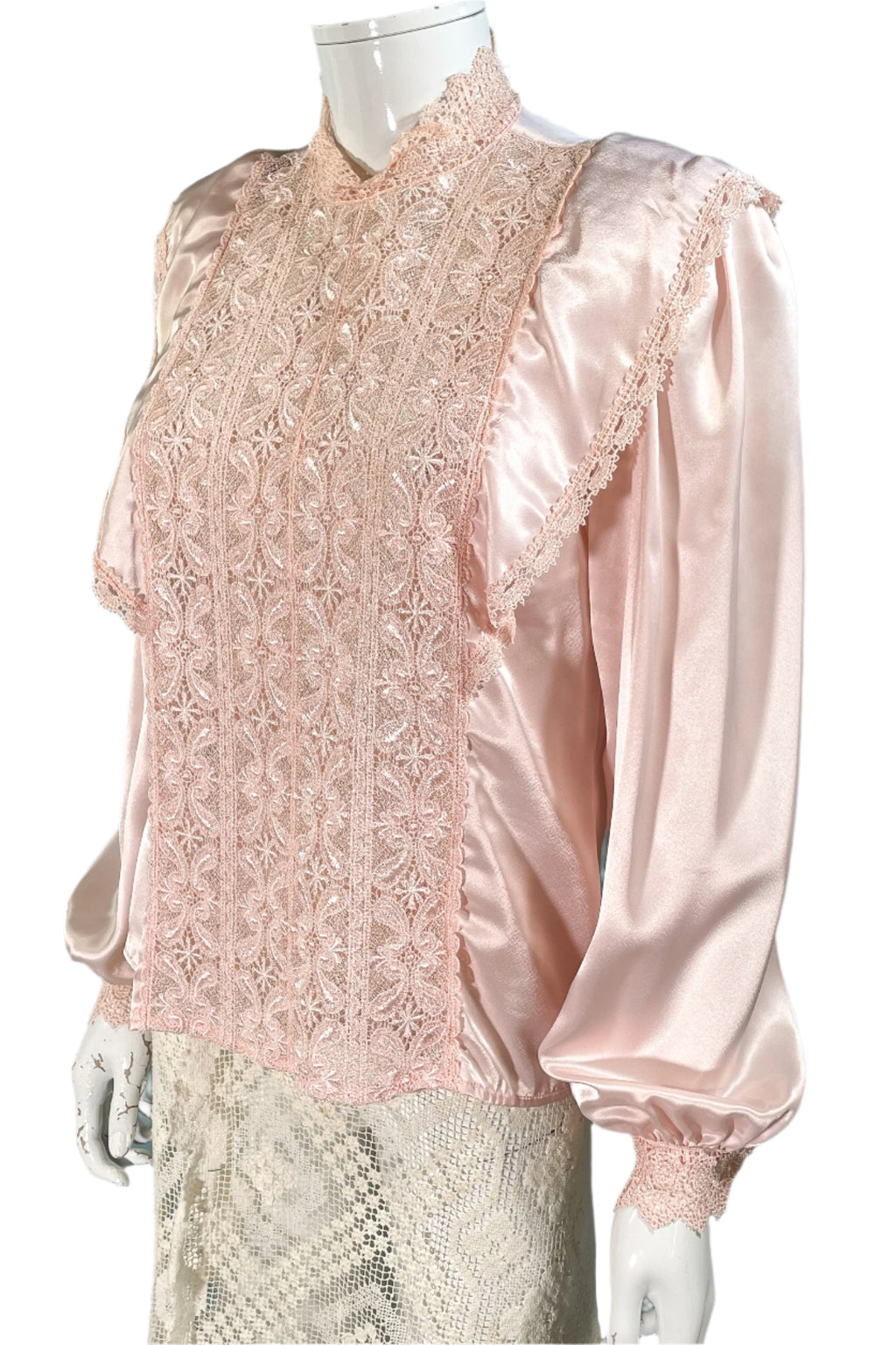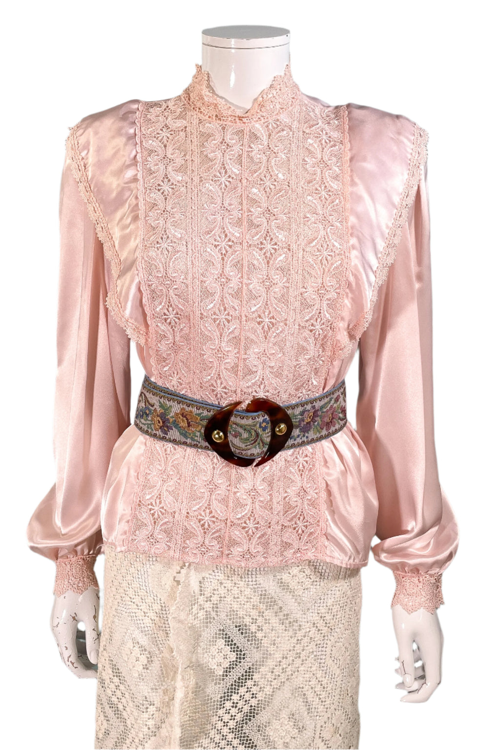 Vintage pink granny Victorian style blouse with cream high lace neckline.
