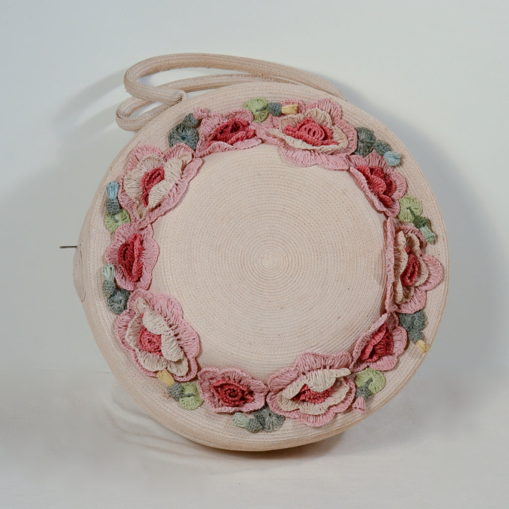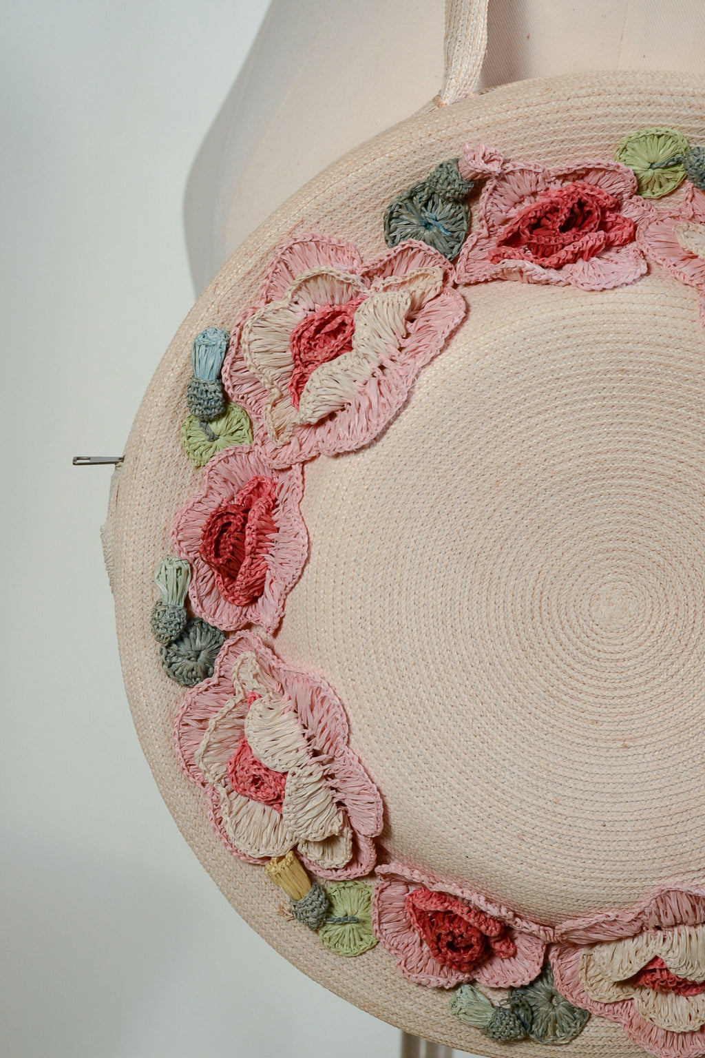 Beautiful raffia flowers accented along the edges on the top of the bag. The back is a simple design with no embellishment.