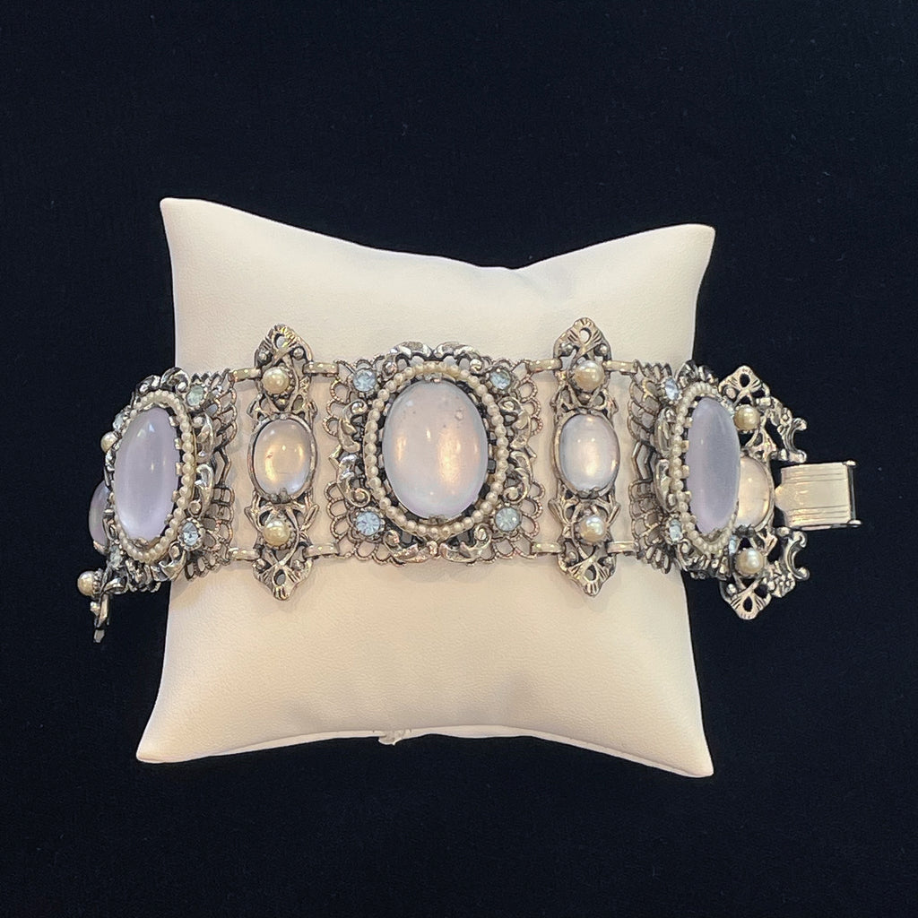 Vintage elaborate silver tone Selro bracelet with 3 large & 4 smaller 'moonglow moonstones, faux pearls, blue rhinestones.