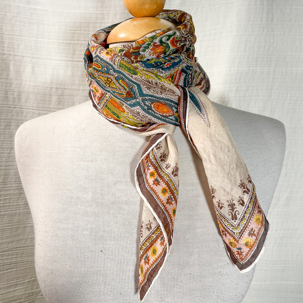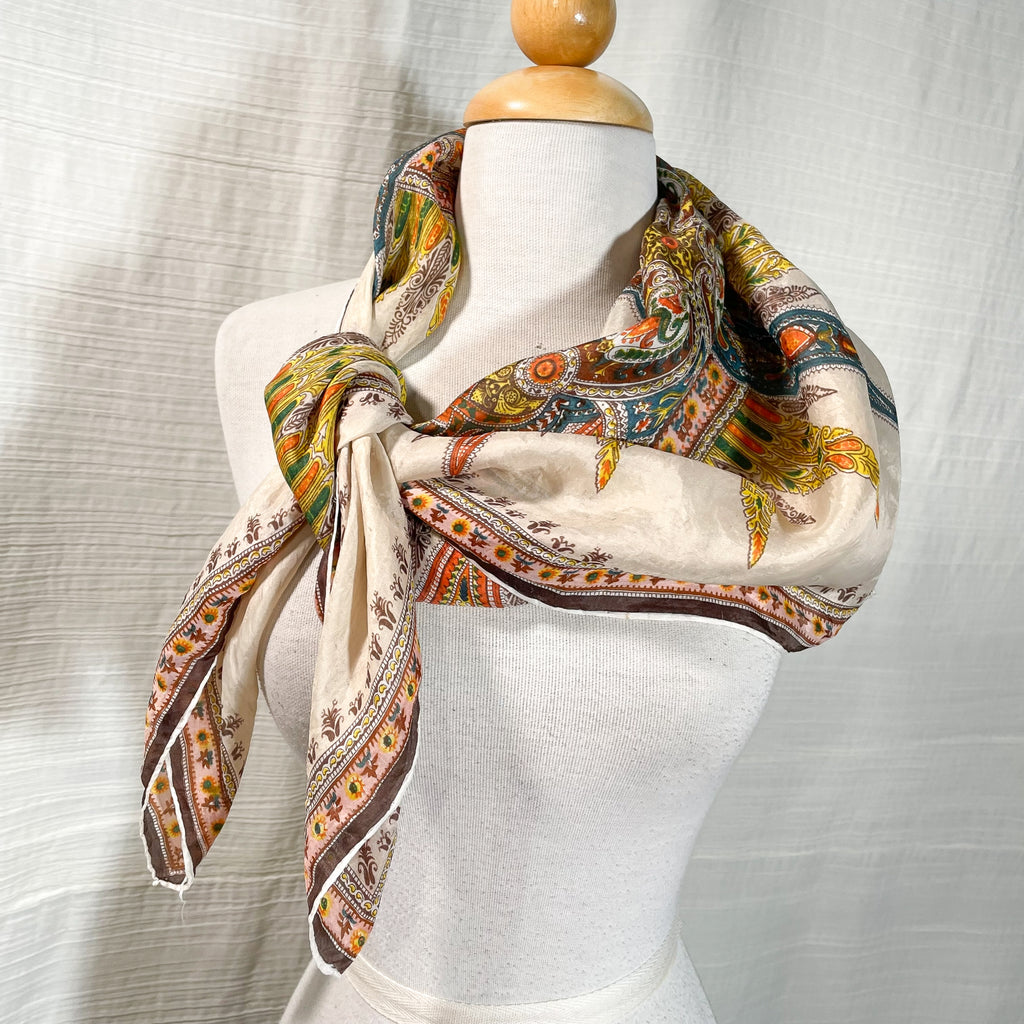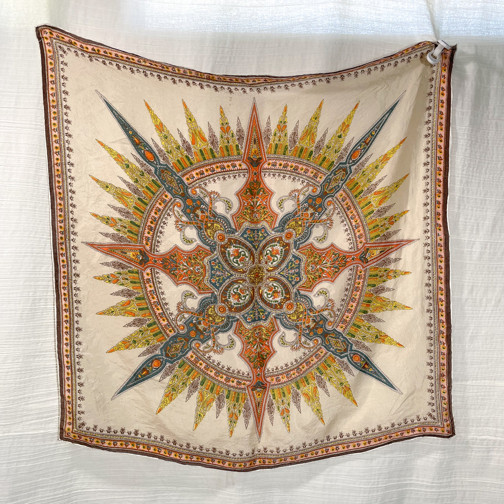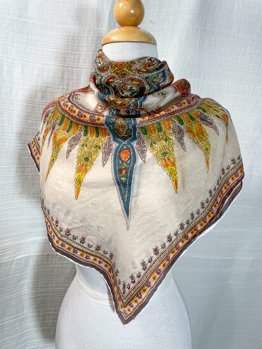Vintage large silk scarf with paisley medallion in the center and printed border.