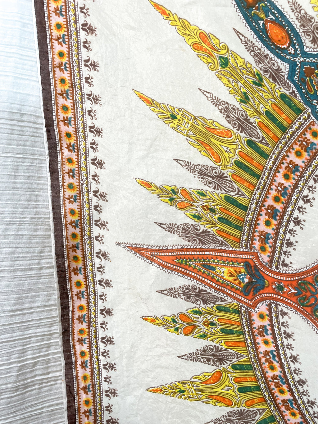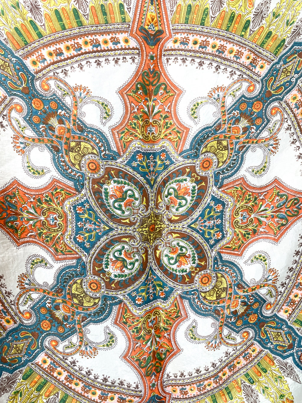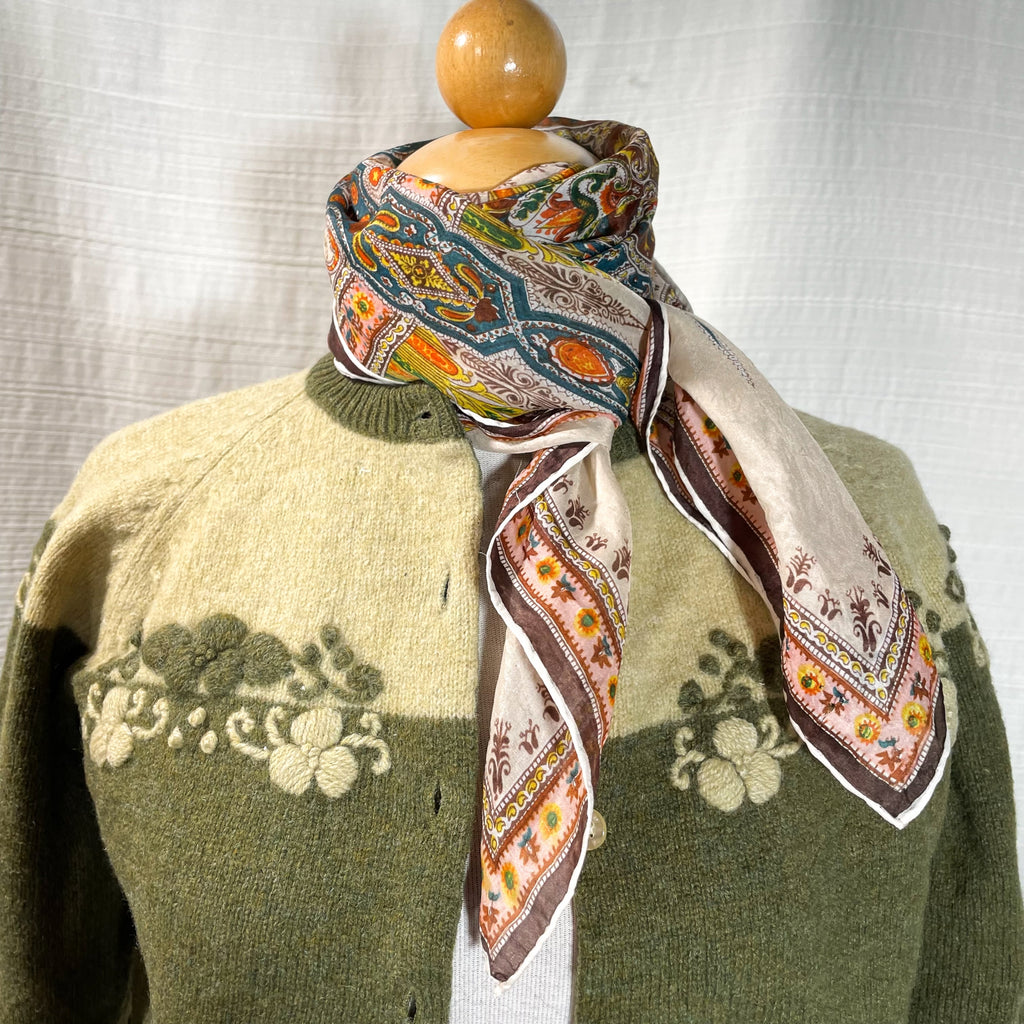 Vintage large silk scarf with paisley medallion in the center and printed border.