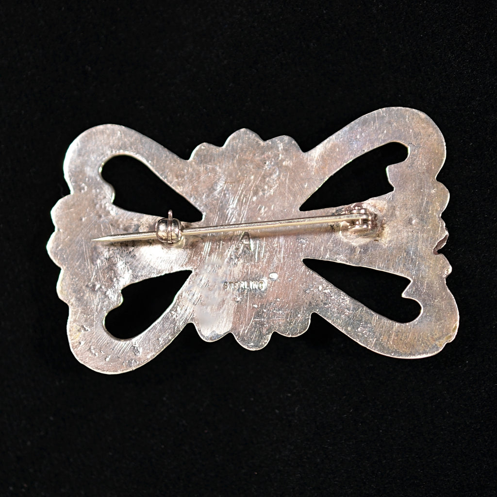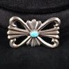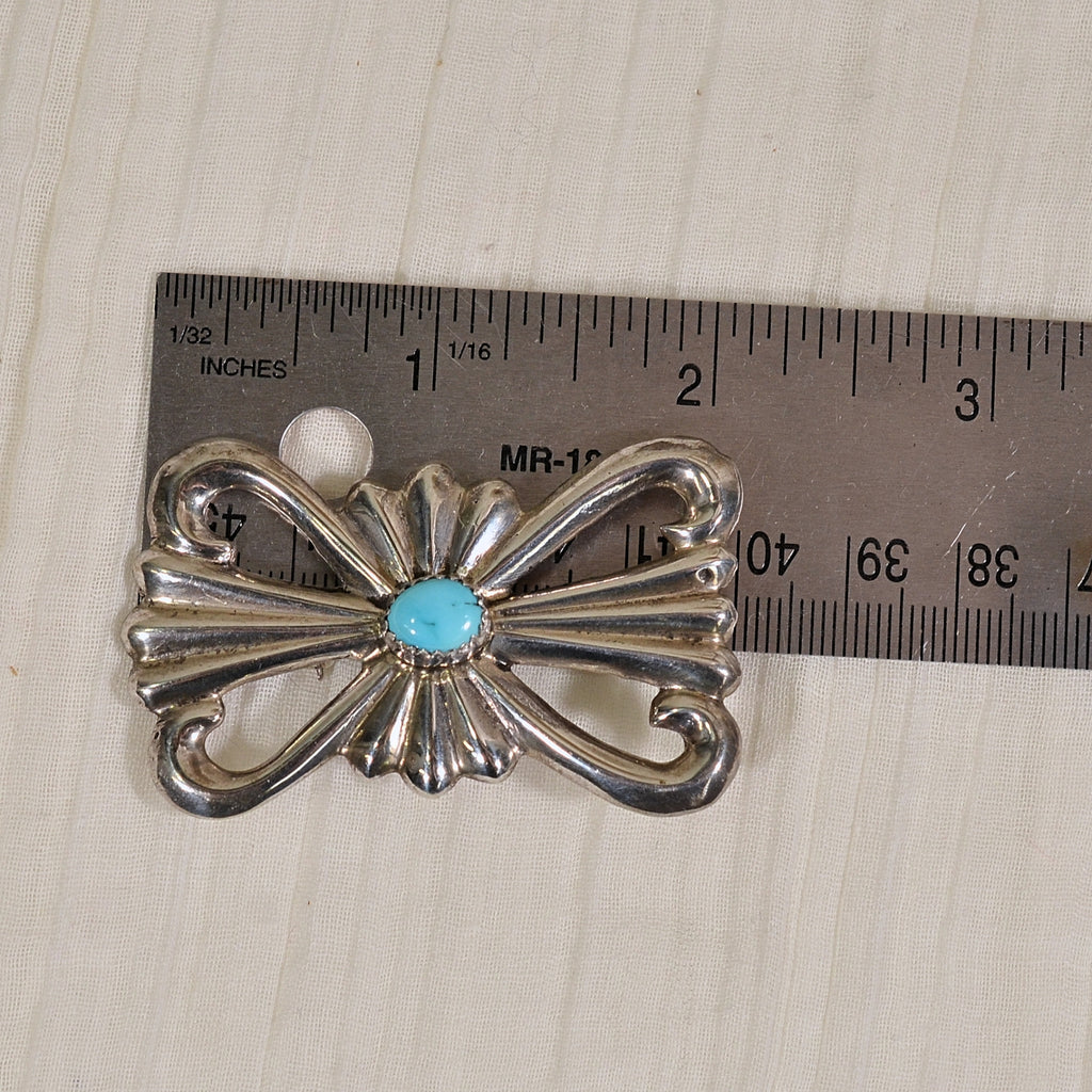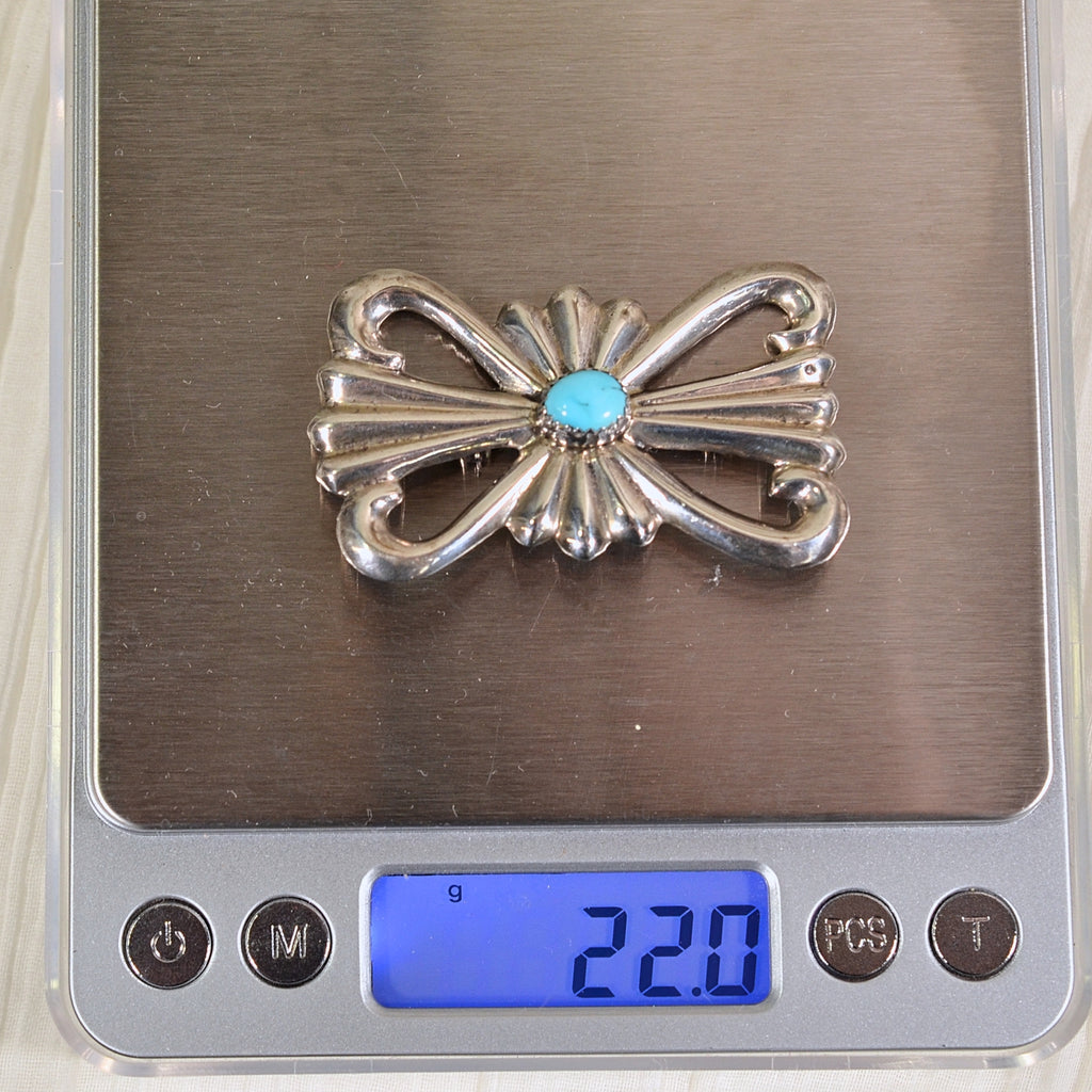 Vintage Navajo sand cast sterling silver swirl pattern brooch with an oval turquoise stone in the center.