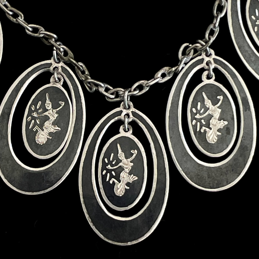 The center of the disc is etched with a Siamese dancer. The background and outer rim are black oxidized finish.