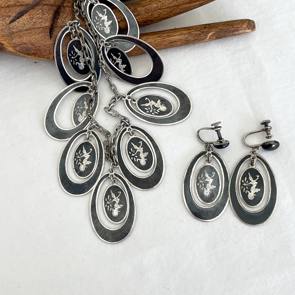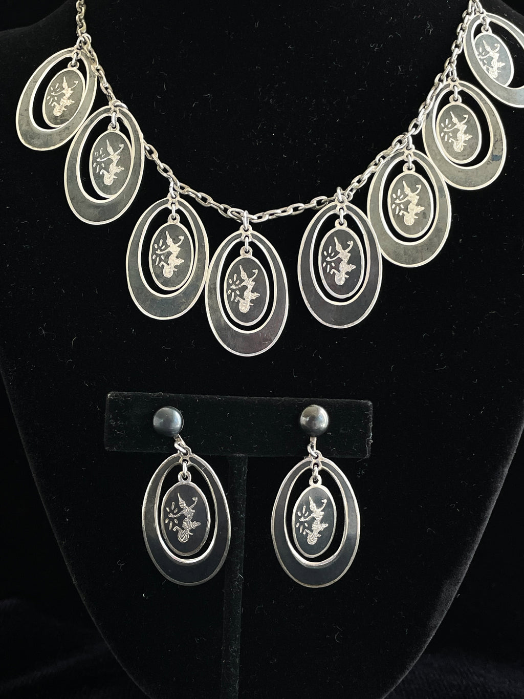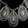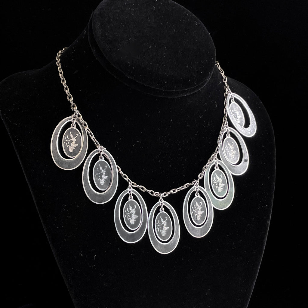 7 etched discs on a silver chain necklace with matching pair of earrings. Articulated discs.