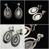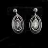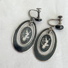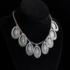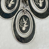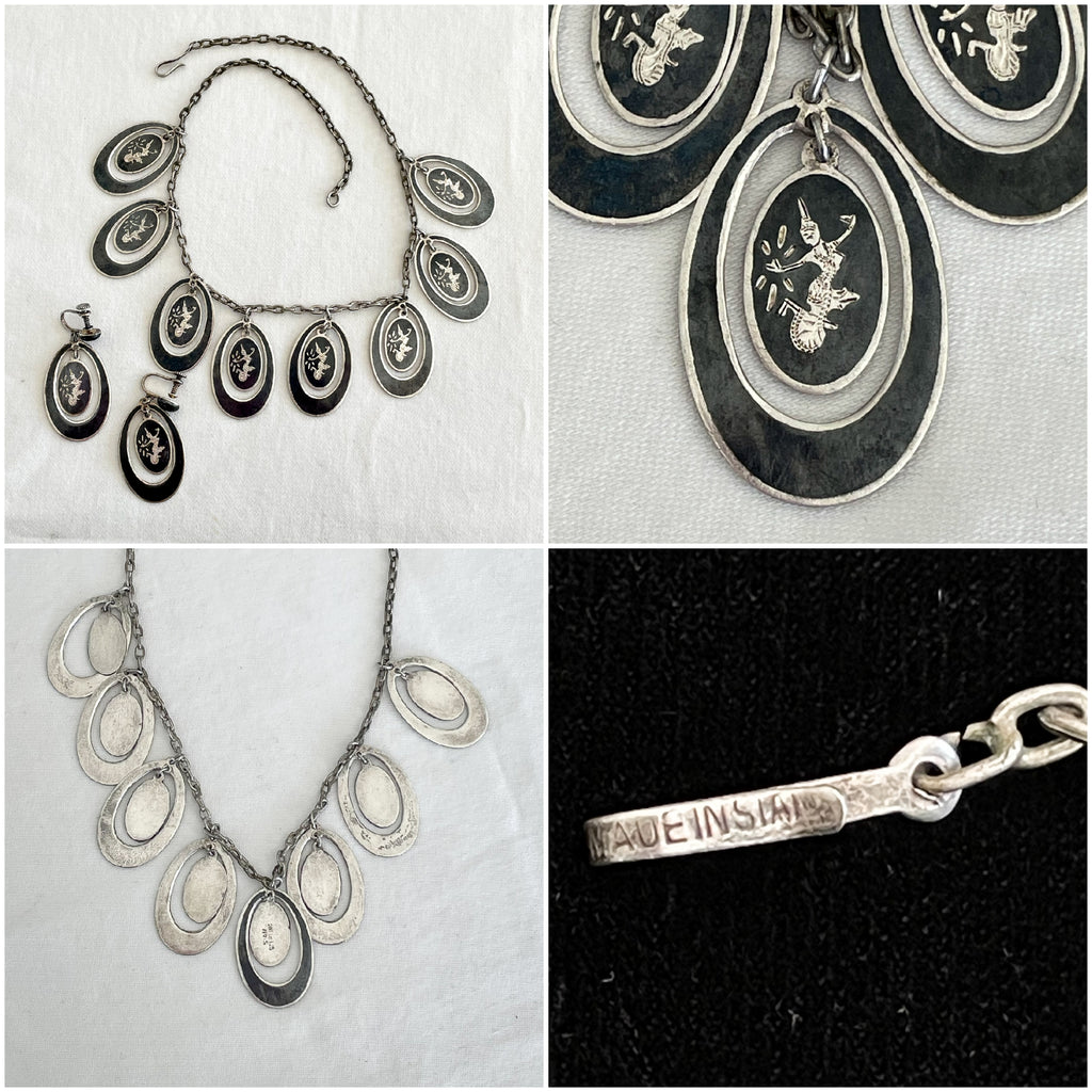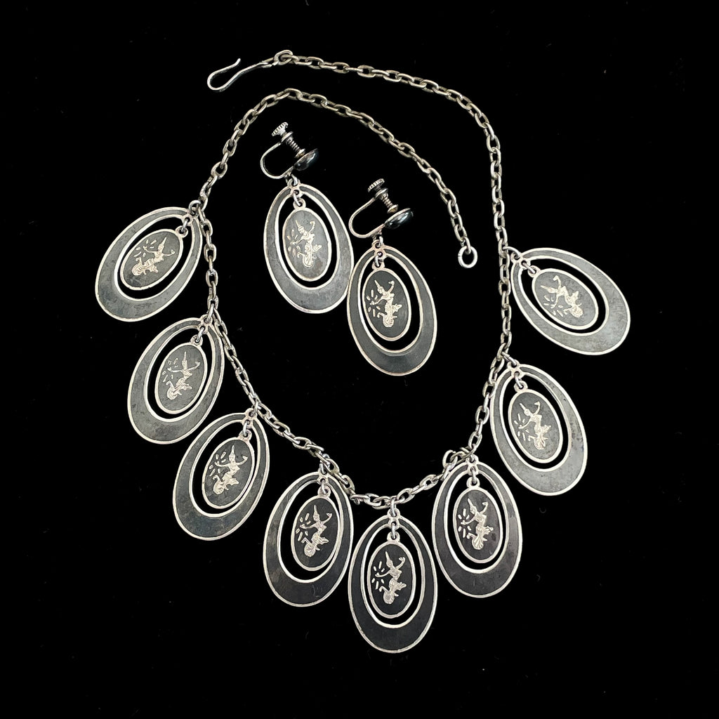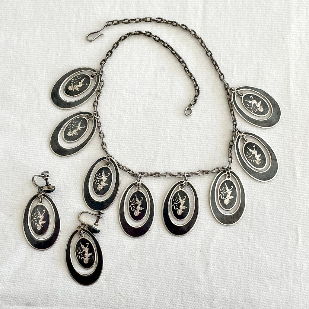 7 etched discs on a silver chain necklace with matching pair of earrings. Articulated discs.