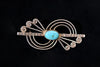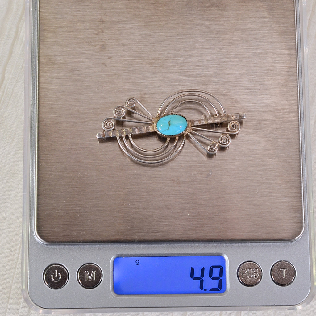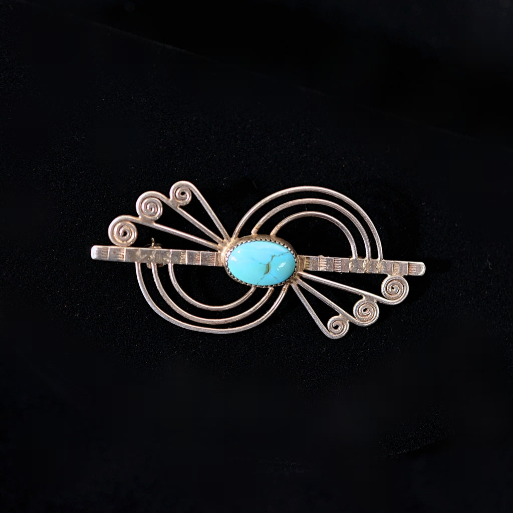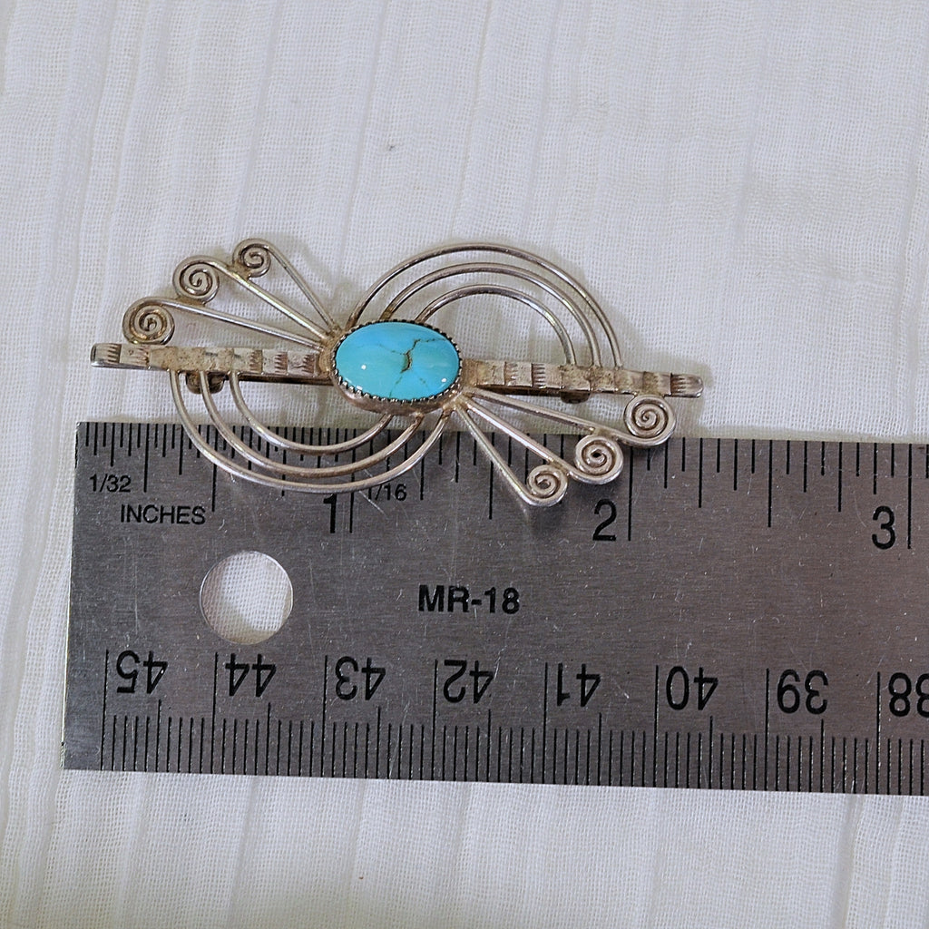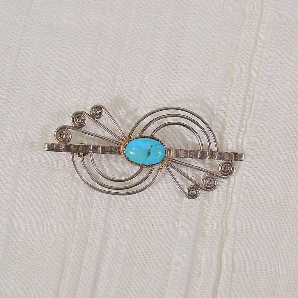 DESCRIPTION: Vintage delicate swirl sterling silver turquoise brooch. There are arches & swirls on the top and bottom of the brooch. There is an oval turquoise stone in the center. The piece is unsigned.