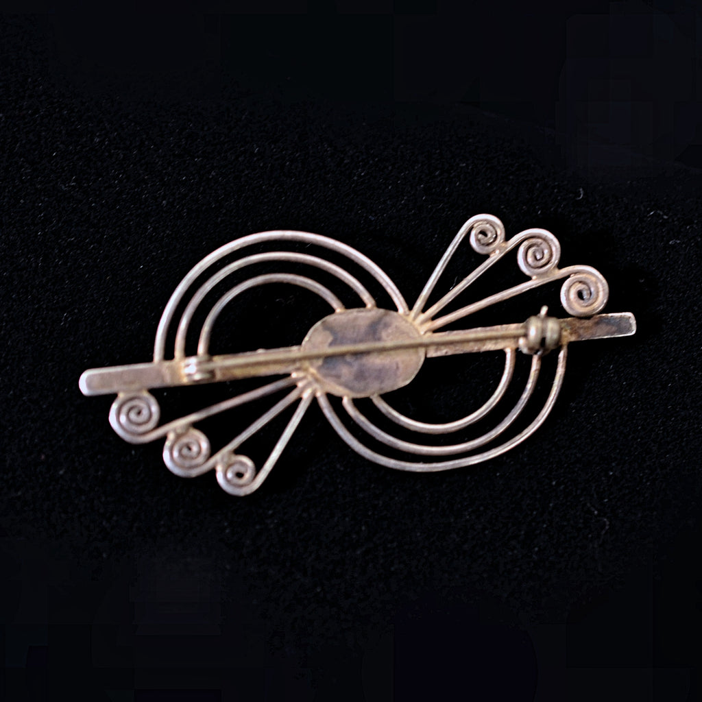 CONDITION: Very good. The solder on one swirl is broken near the bar. It does not affect the look or wearability of the piece. It is a very easy fix by a jeweler.