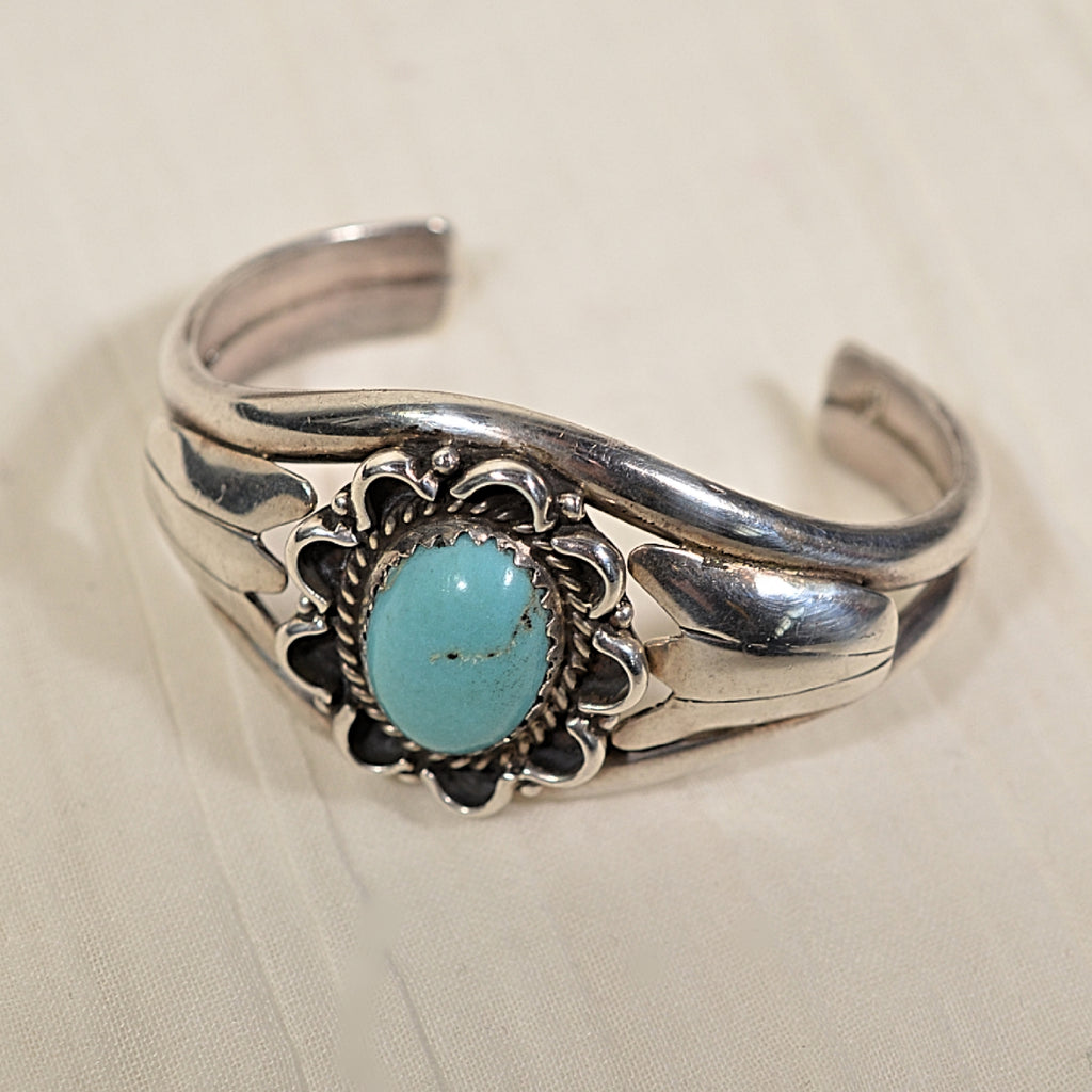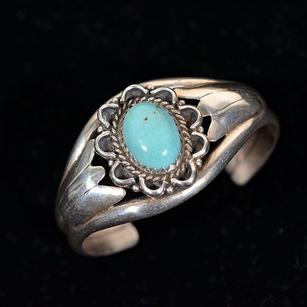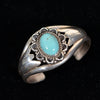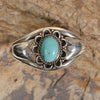 Vintage Silver Native American cuff with a turquoise stone in the center. The stone is surrounded by wire and scallop-shaped detailing. Either side of the stone is flanked by a flower detail.