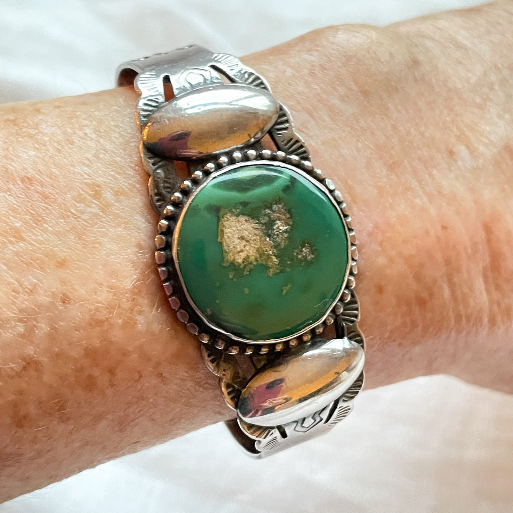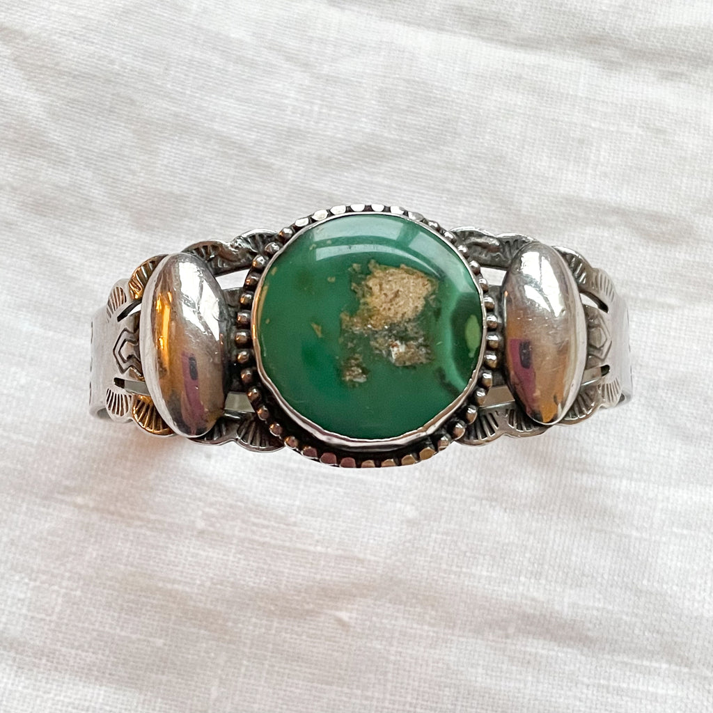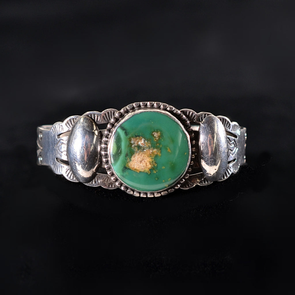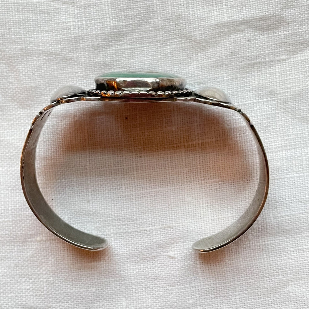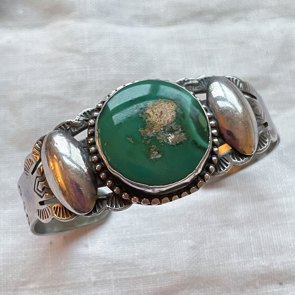 Round green turquoise stone in the center of the bracelet, flanked by oval raised silver beads, stamping on the sides of the bracelet.
