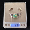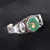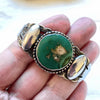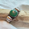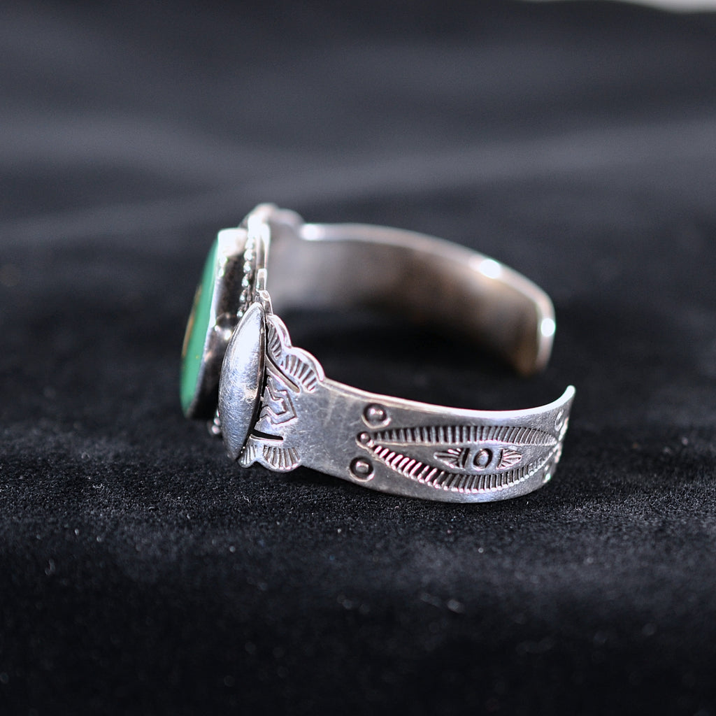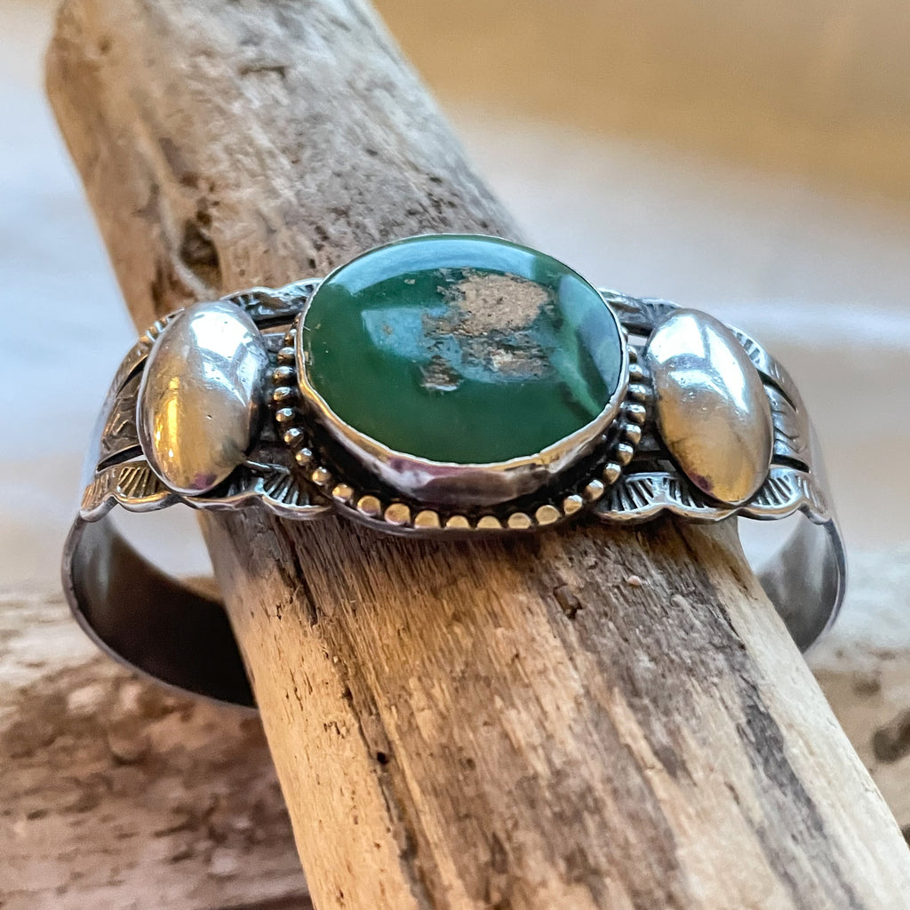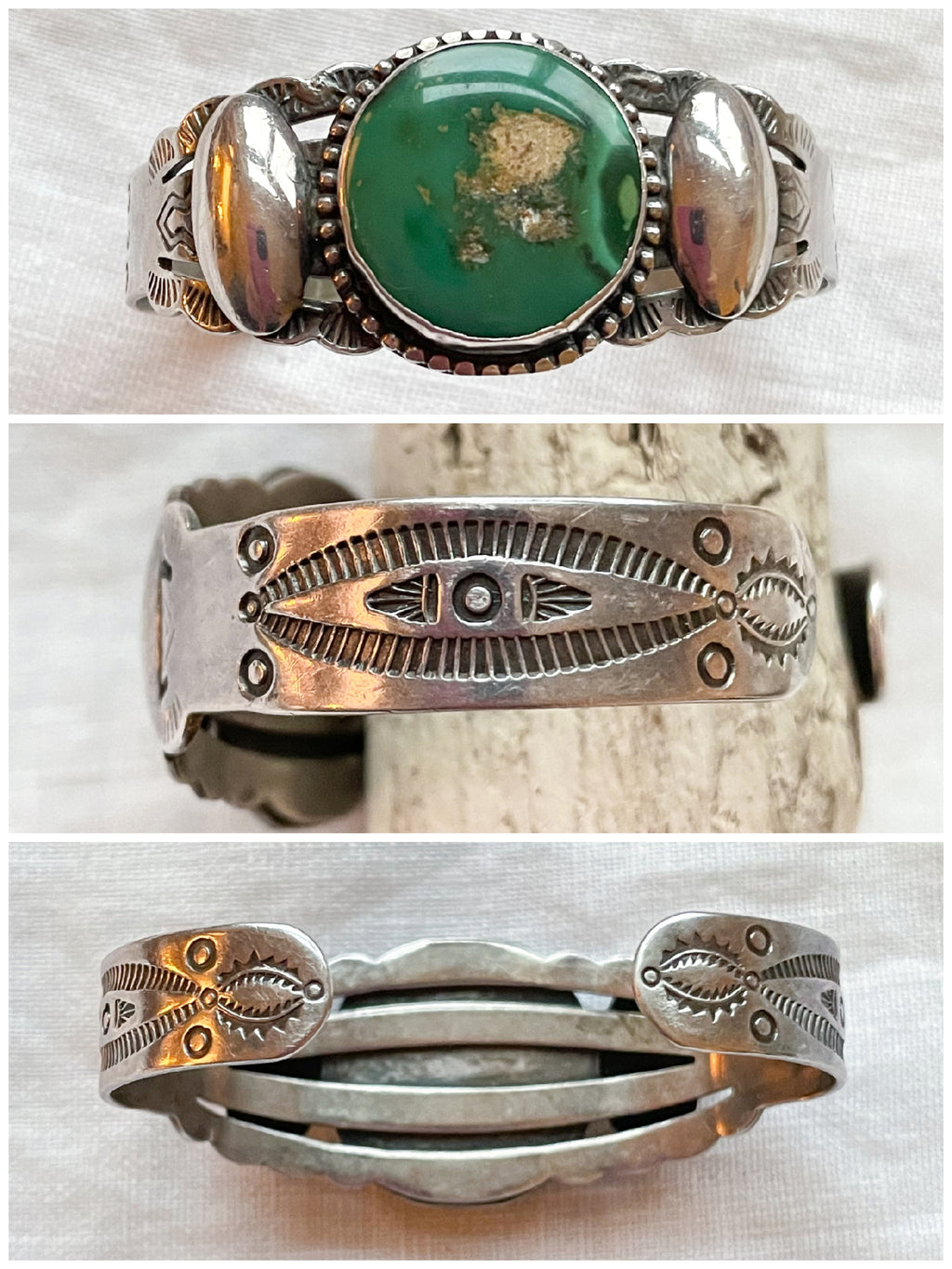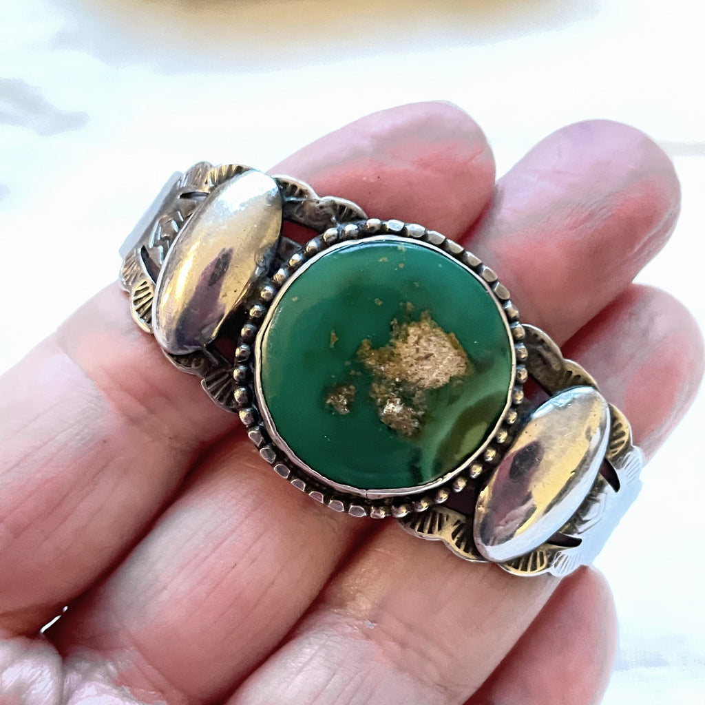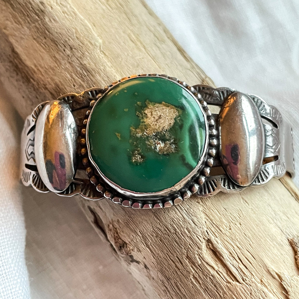 Round green turquoise stone in the center of the bracelet, flanked by oval raised silver beads, stamping on the sides of the bracelet.
