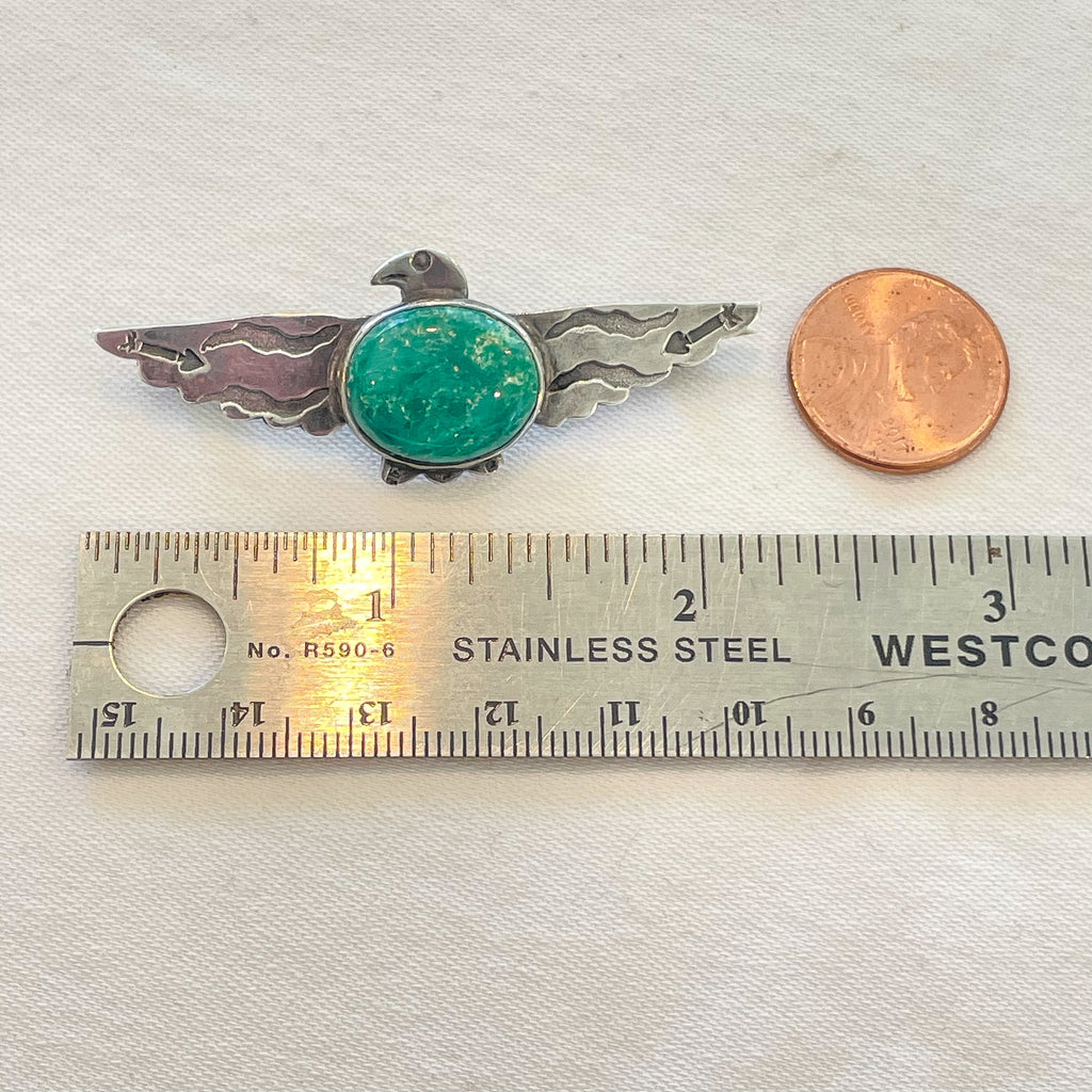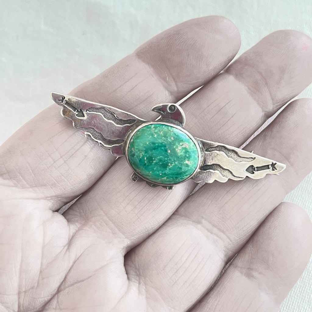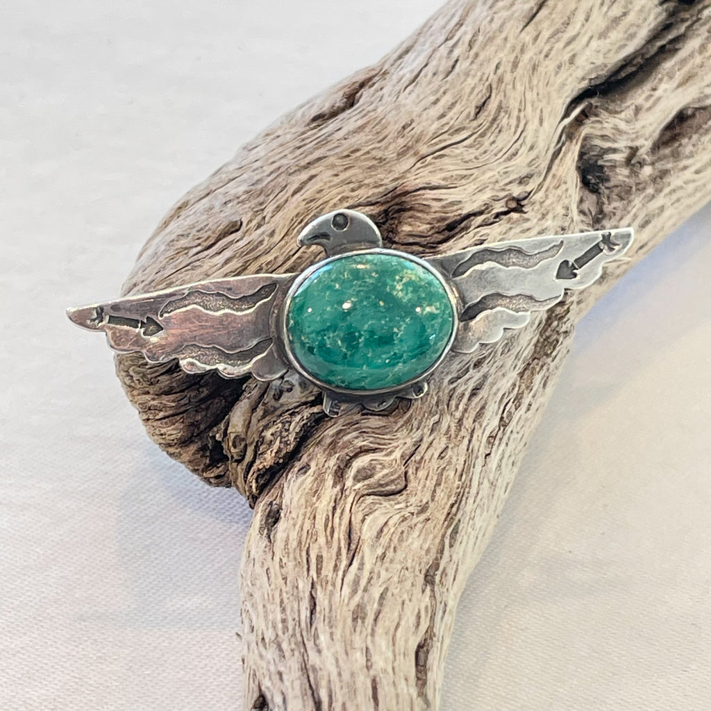 Vintage Sterling Silver Turquoise Thunderbird Brooch, Fred Harvey Era Pin 2 1/4" L