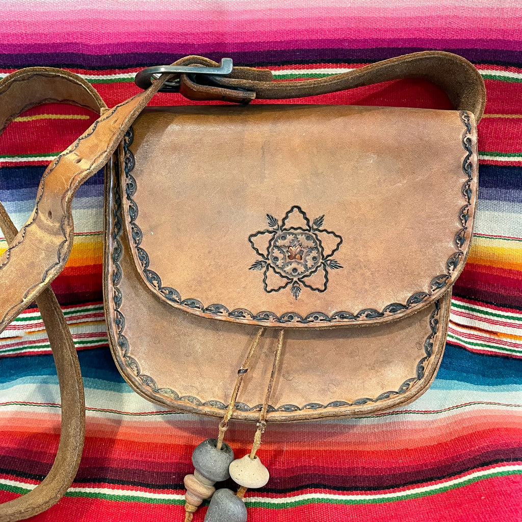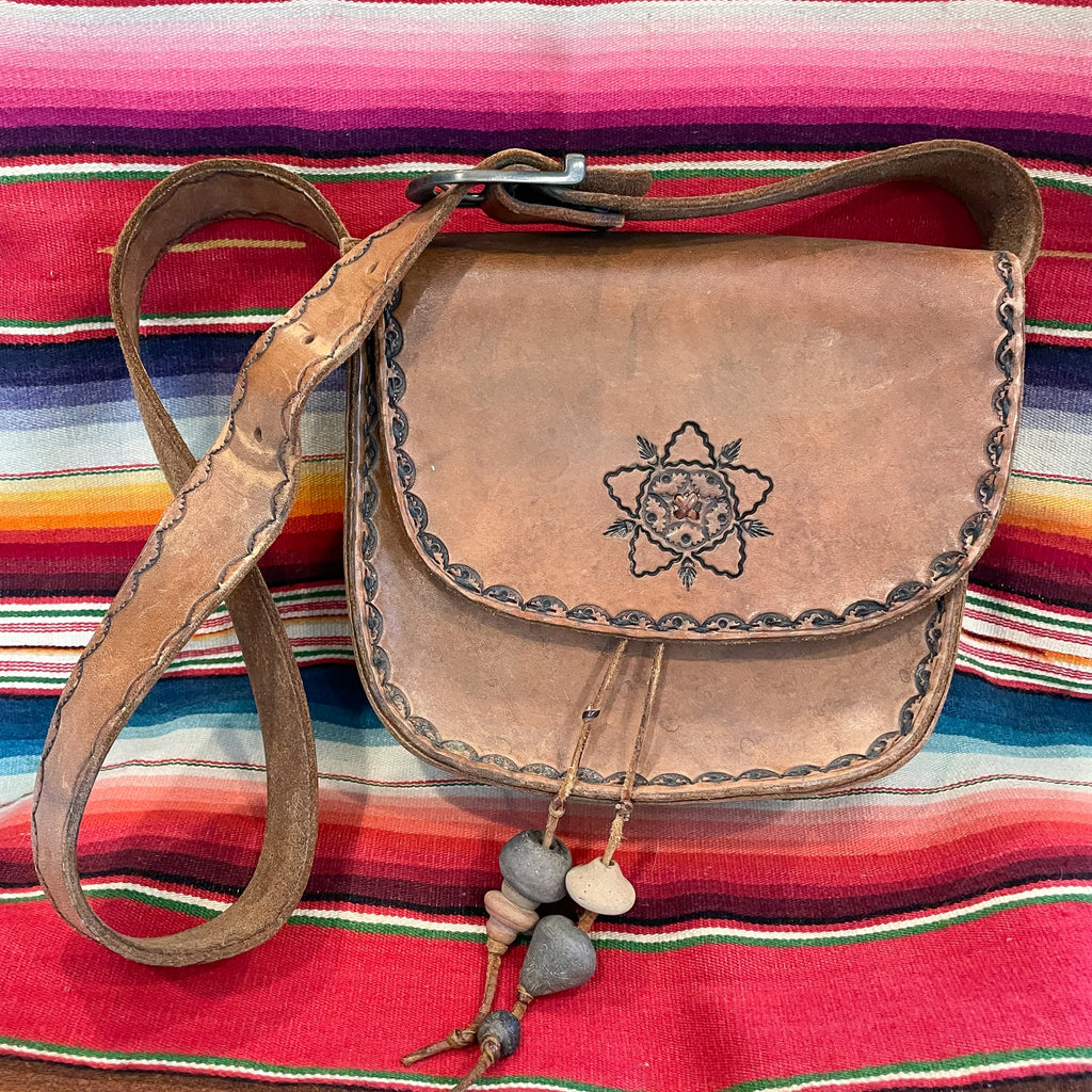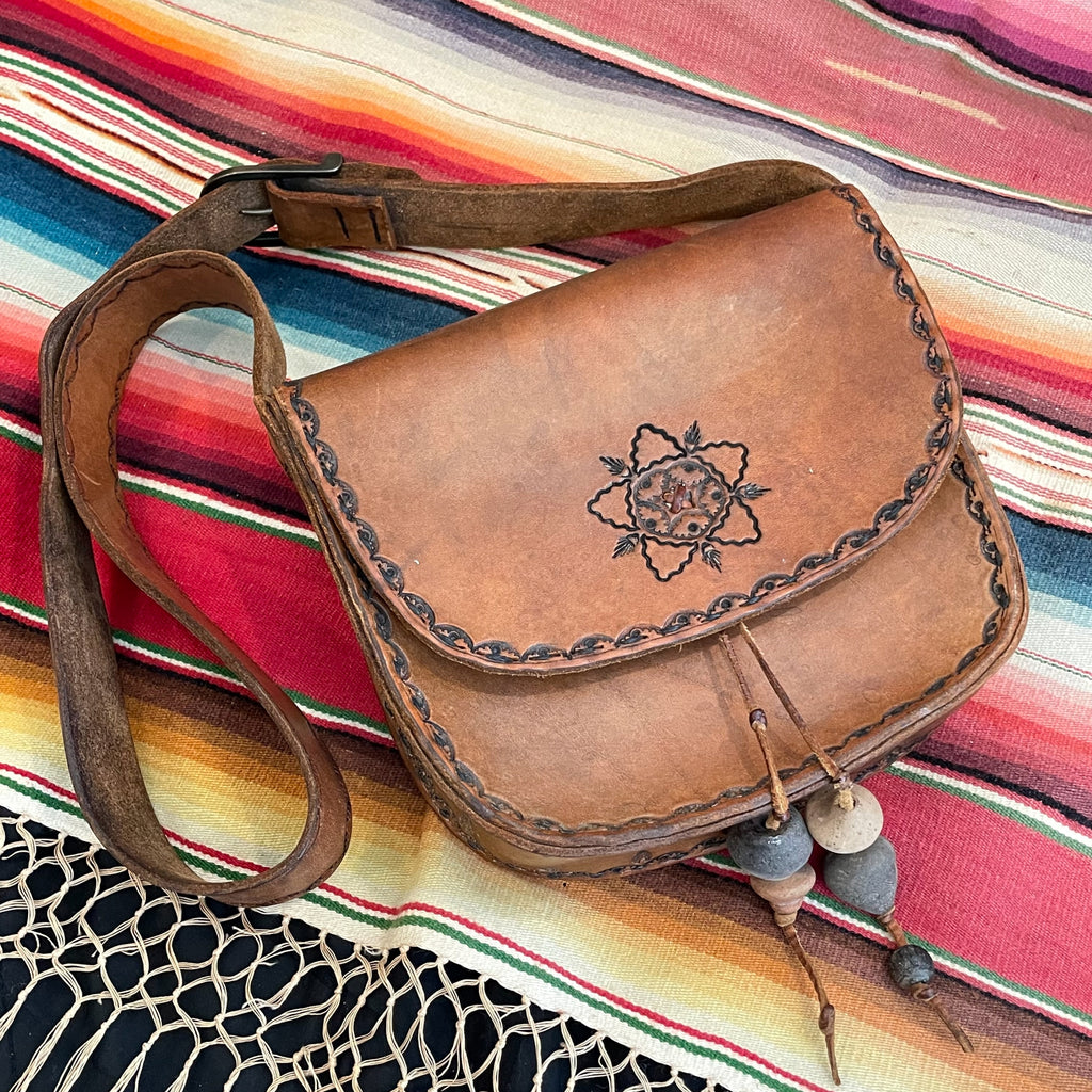 Cool vintage 70s Southwestern tooled leather shoulder handbag.