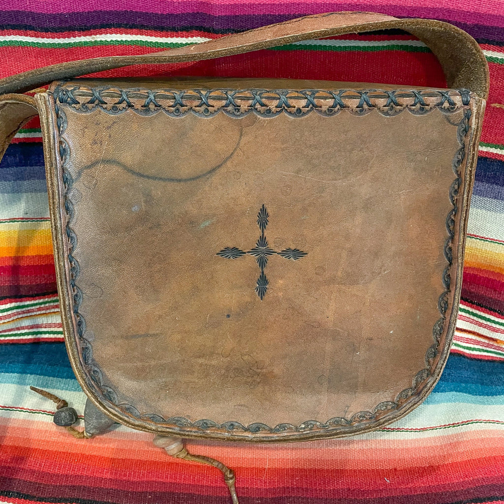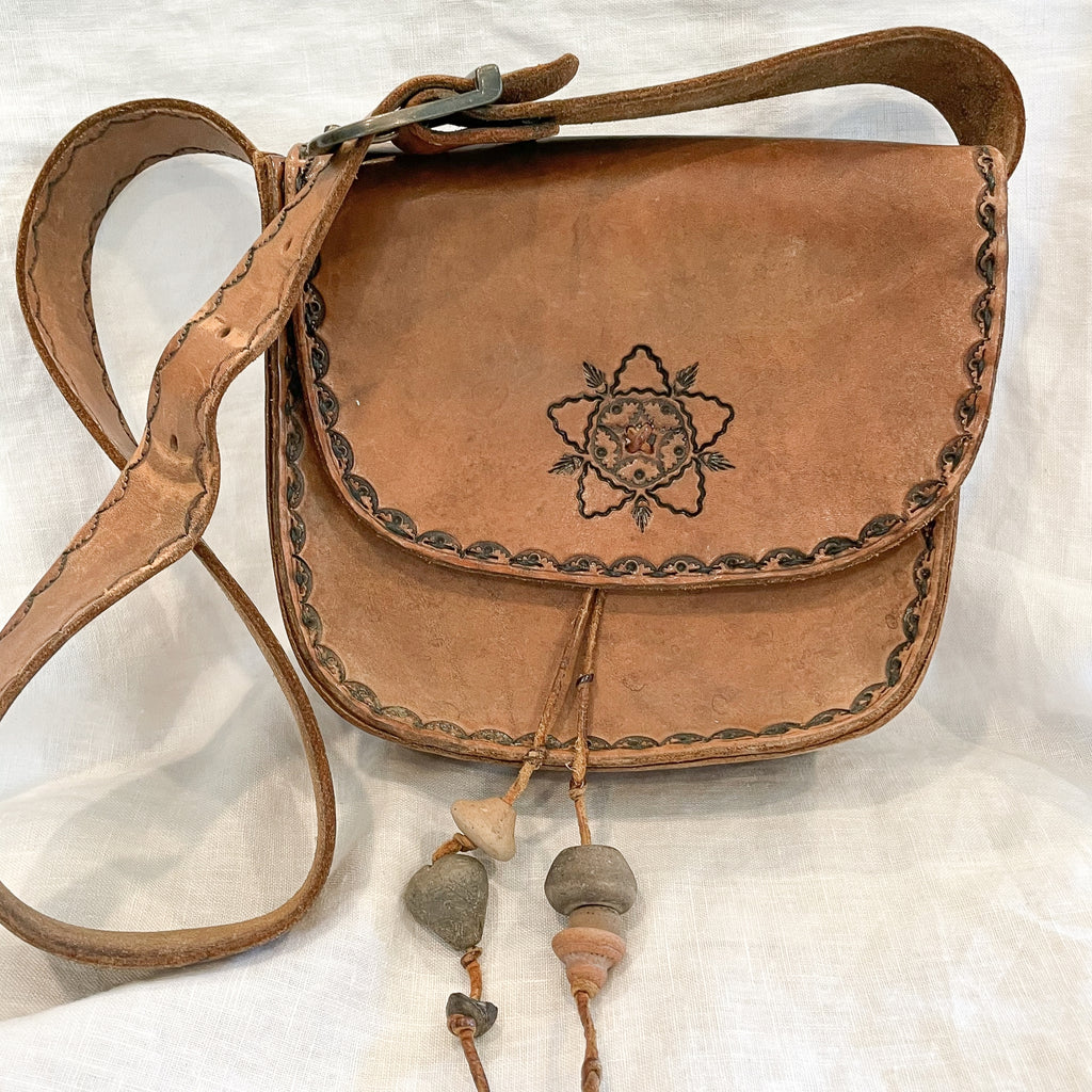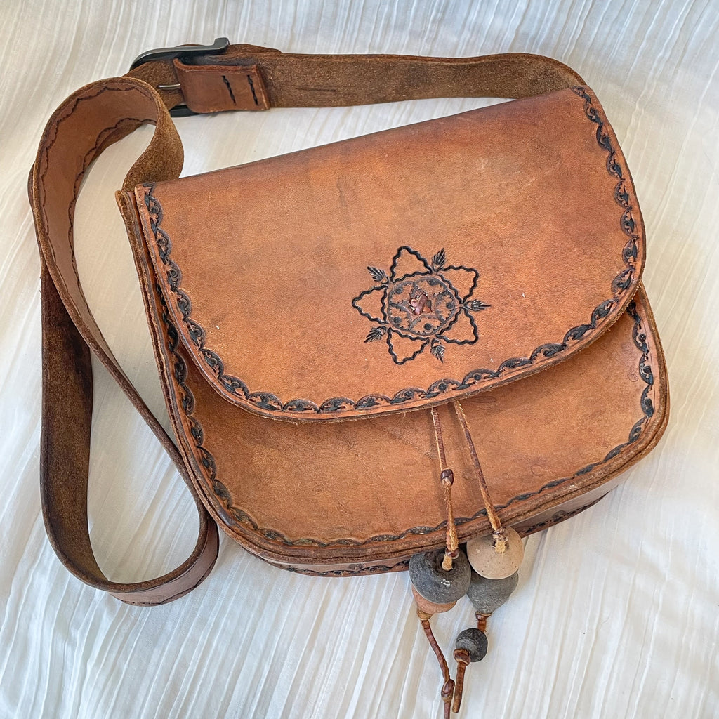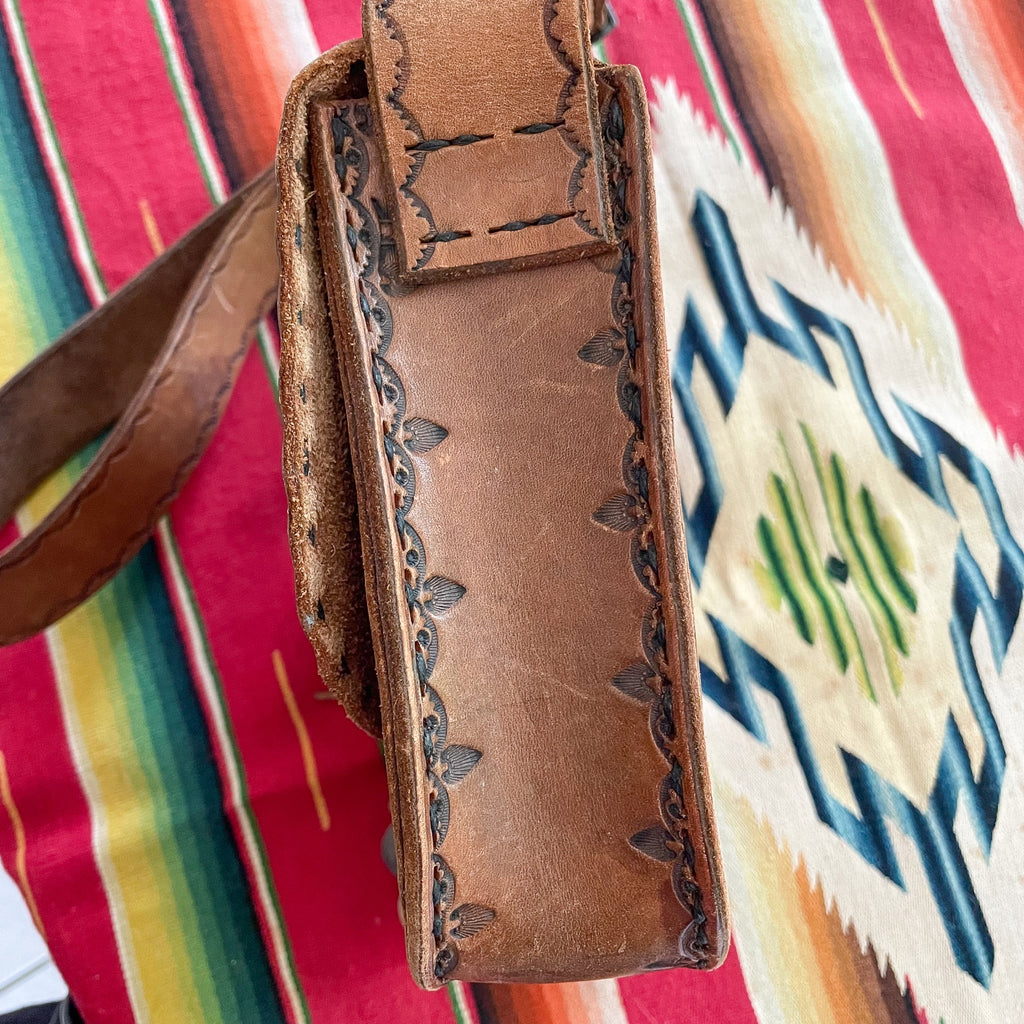 Cool vintage 70s Southwestern tooled leather shoulder handbag.