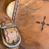 Accented with rustic ceramic beads hanging from leather laces, Hand-tooled leather, Thread stitched on seams, hand stamped on sides.