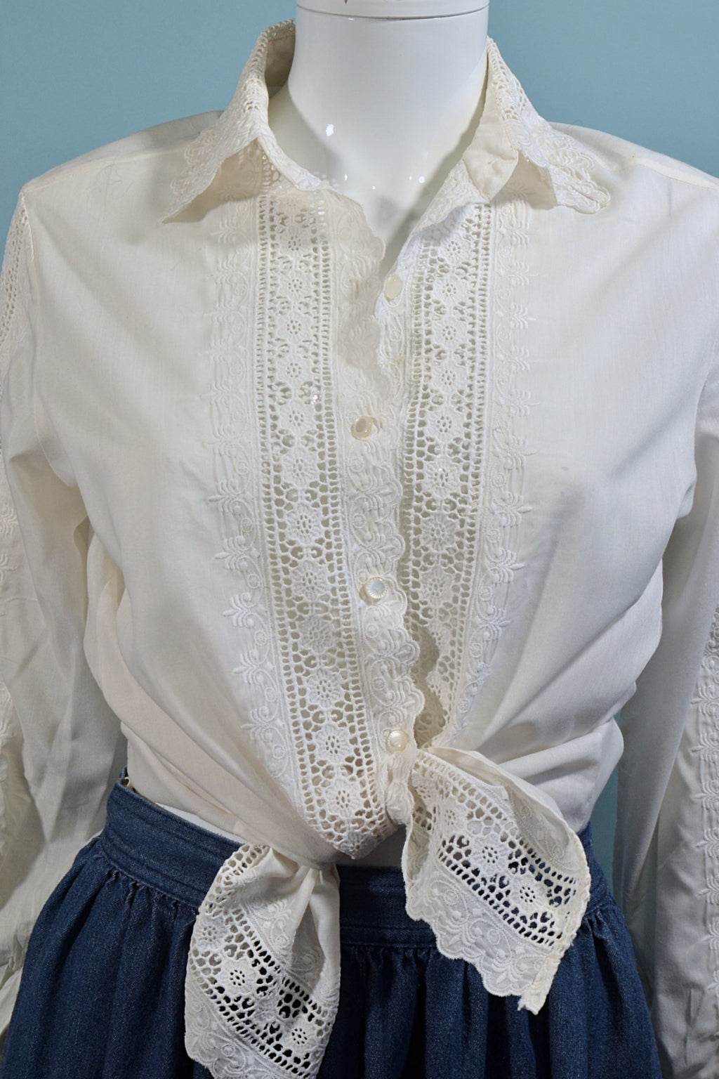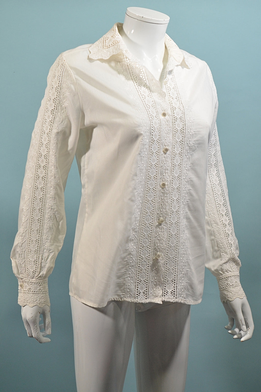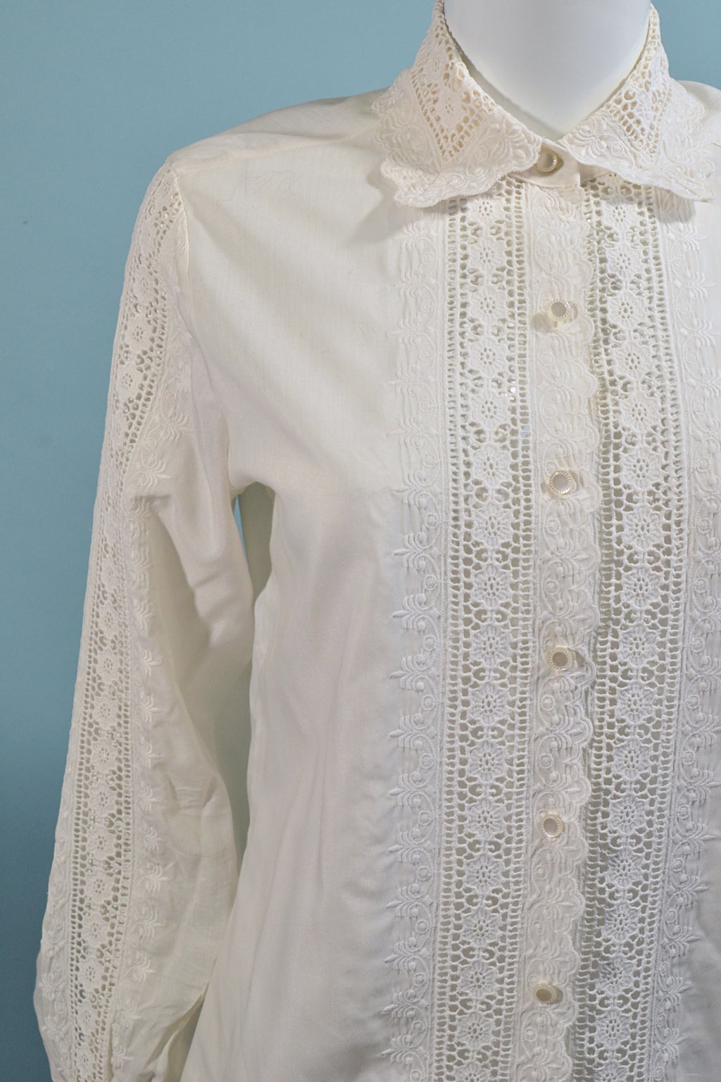 Vintage white cotton blouse with cut-out lace and embroidered details.